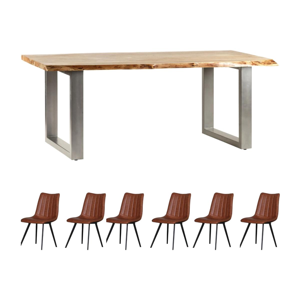 Unveil the beauty of natural design with the Natural Essential Live Edge Dining Table Set. Handcrafted from sustainable Acacia wood, this large table radiates natural wood colour with a matte finish. Its solid metal base elevates its modern aesthetic, while the 6 accompanying vegan leather chairs feature striking vertical accent stitching for a timeless look. Comfortable and easy to clean, this set is perfect for memorable dining experiences.