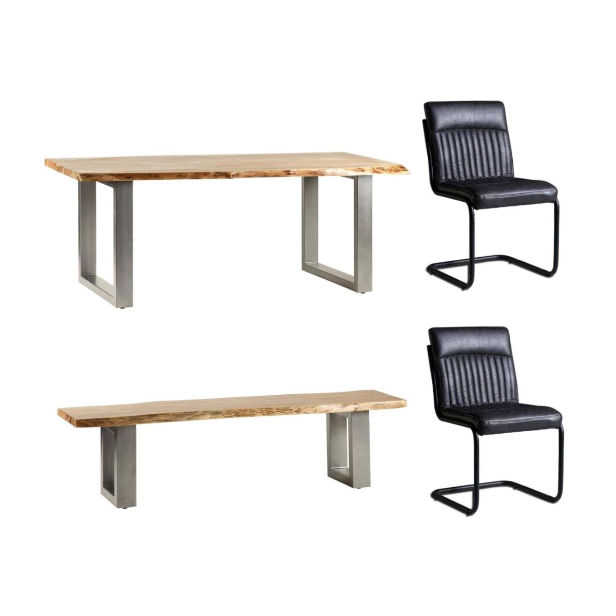 Bring extraordinary style to your home with this Natural Essential Live Edge Large Dining Table Set. This set includes 1 dining table, 2 chairs, and 1 bench, each crafted with sustainable sourced solid Acacia Wood in a natural wood colour with a matte finish. The chairs add a warm industrial style with a black powder coated metal frame and a dark grey PU leather seat. The bench is the perfect complement to the table and offers a combination of craftsmanship and style. Make this exquisite set yours today and level-up your dcor with elegance and sophistication.