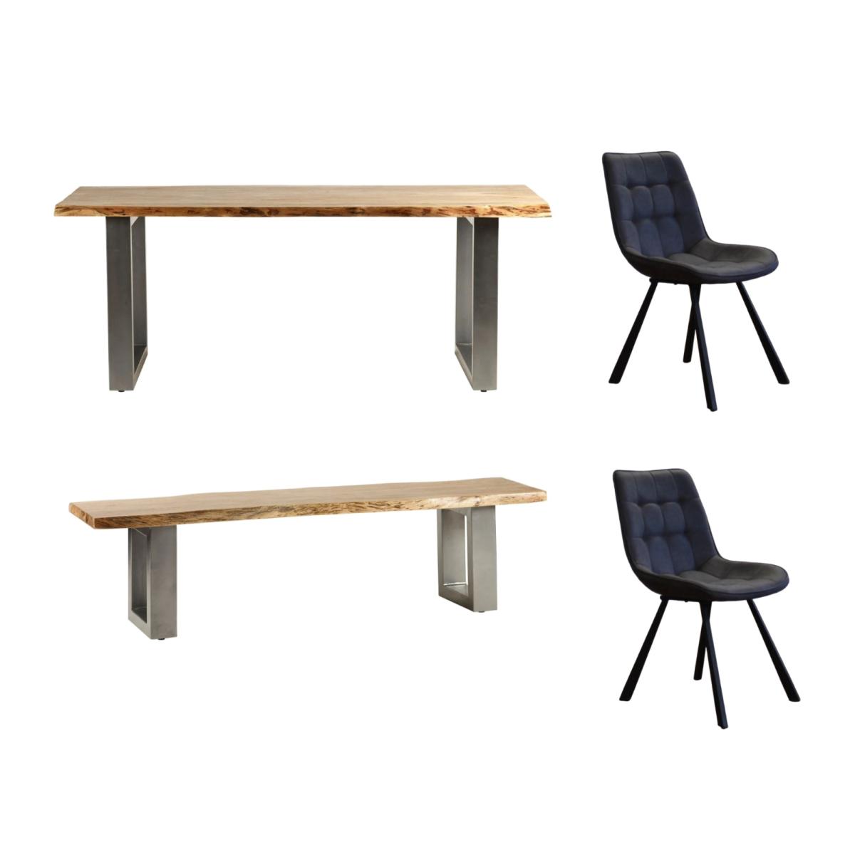 This Natural Essential Live Edge Medium Dining Table Set is an exquisite choice. Handcrafted from sustainably-sourced solid Acacia Wood, its natural wood colour is complemented with a matte finish and a sturdy metal base. Industrial Style Chairs feature steel tapered tube legs with black powder-coating, plus a Light Brown Tan PU leather seat. To complete the look, the Grey Essential Live Edge Dining Bench is handcrafted from the same sustainable material, with a matte finish and metal base. Create a stunning dining experience with this exquisite set.