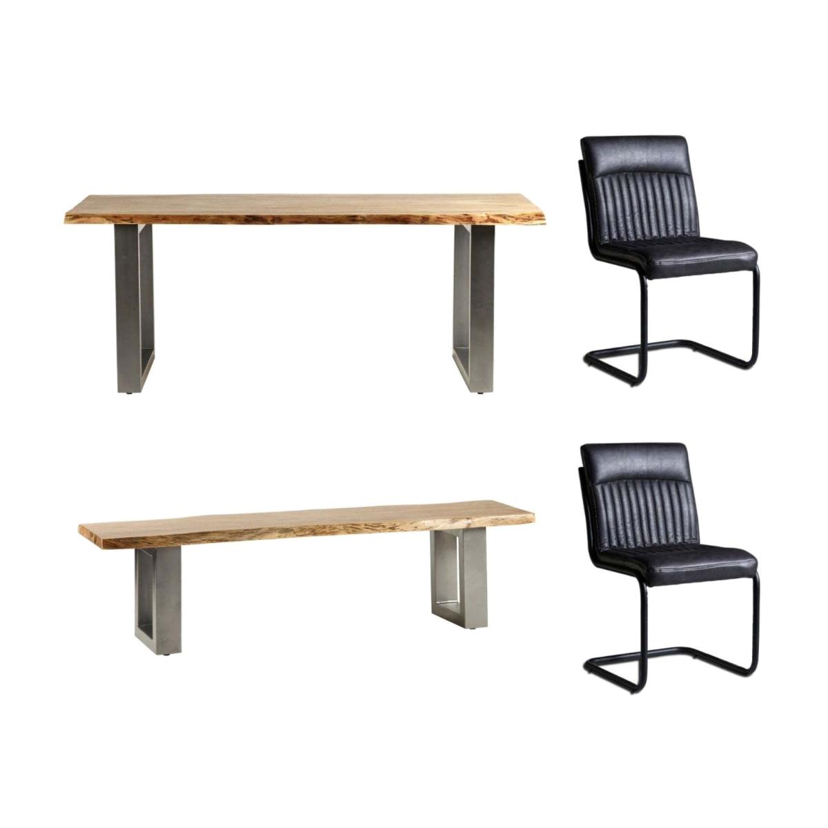 Experience exquisite, handcrafted craftsmanship with our Natural Essential Live Edge Medium Dining Table Set! The solid Acacia Wood dining table is sustainably sourced and features a natural wood colour with a matte finish plus a metal base. Our Industrial Style Chairs made from black powder-coated metal frames are extra comfortable with a padded, dark grey PU leather seat. Our Grey Essential Live Edge Dining Bench brings the whole look together - also crafted from sustainably sourced Acacia Wood and a metal base, it completes the perfect dining set.
