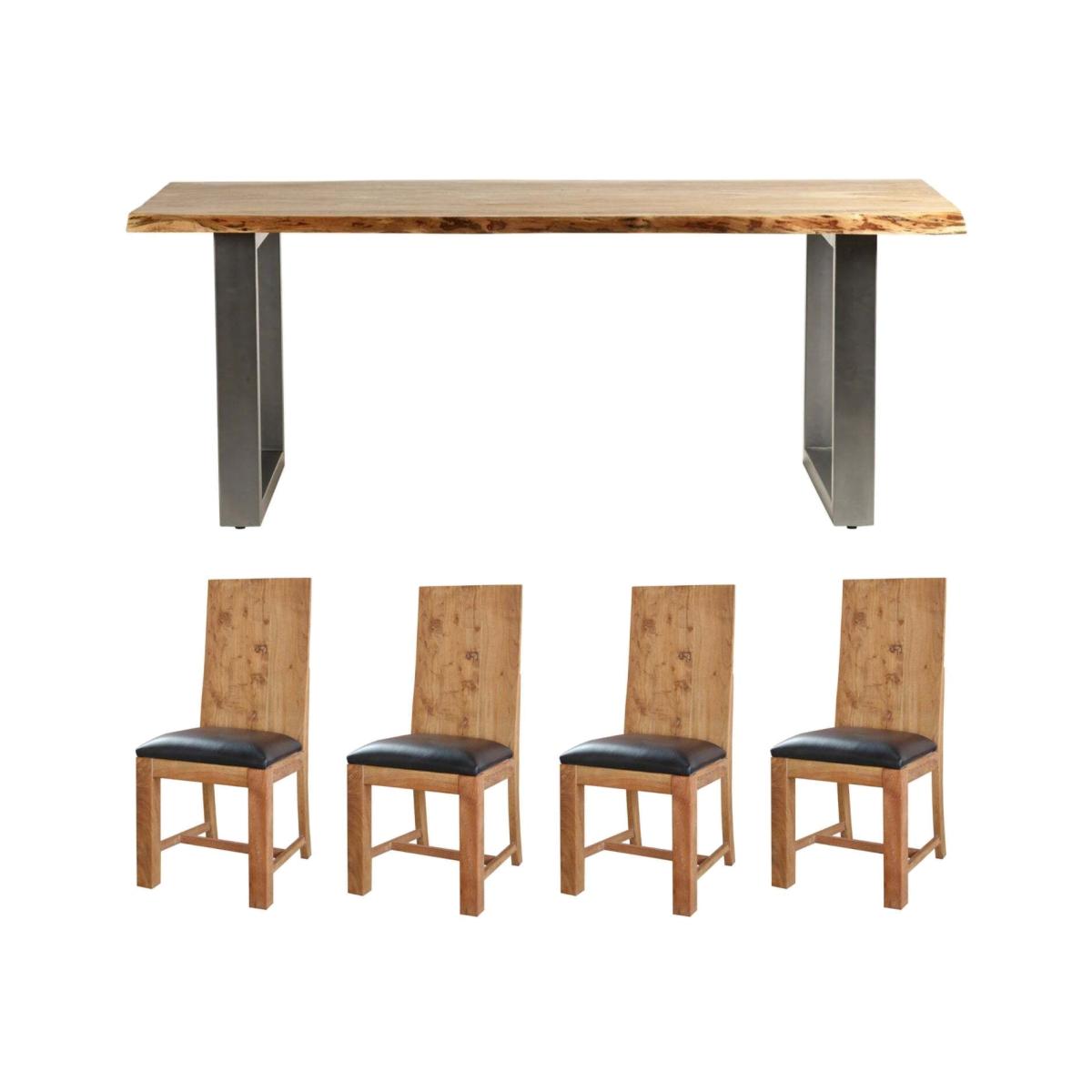 This Natural Essential Live Edge Medium Dining Table Set includes 1 Dining Table and 4 Chairs. The Table is crafted with sustainable sourced solid Acacia Wood, with a natural wood colour and matte finish, plus a solid metal base. The Chairs feature a robust design with Solid Acacia Hardwood and a padded seat covered in black leather, plus a high back for comfort and style. Buy it as a set of 1 Table and 4 Chairs, or use them to add a fresh look to your existing dining set.