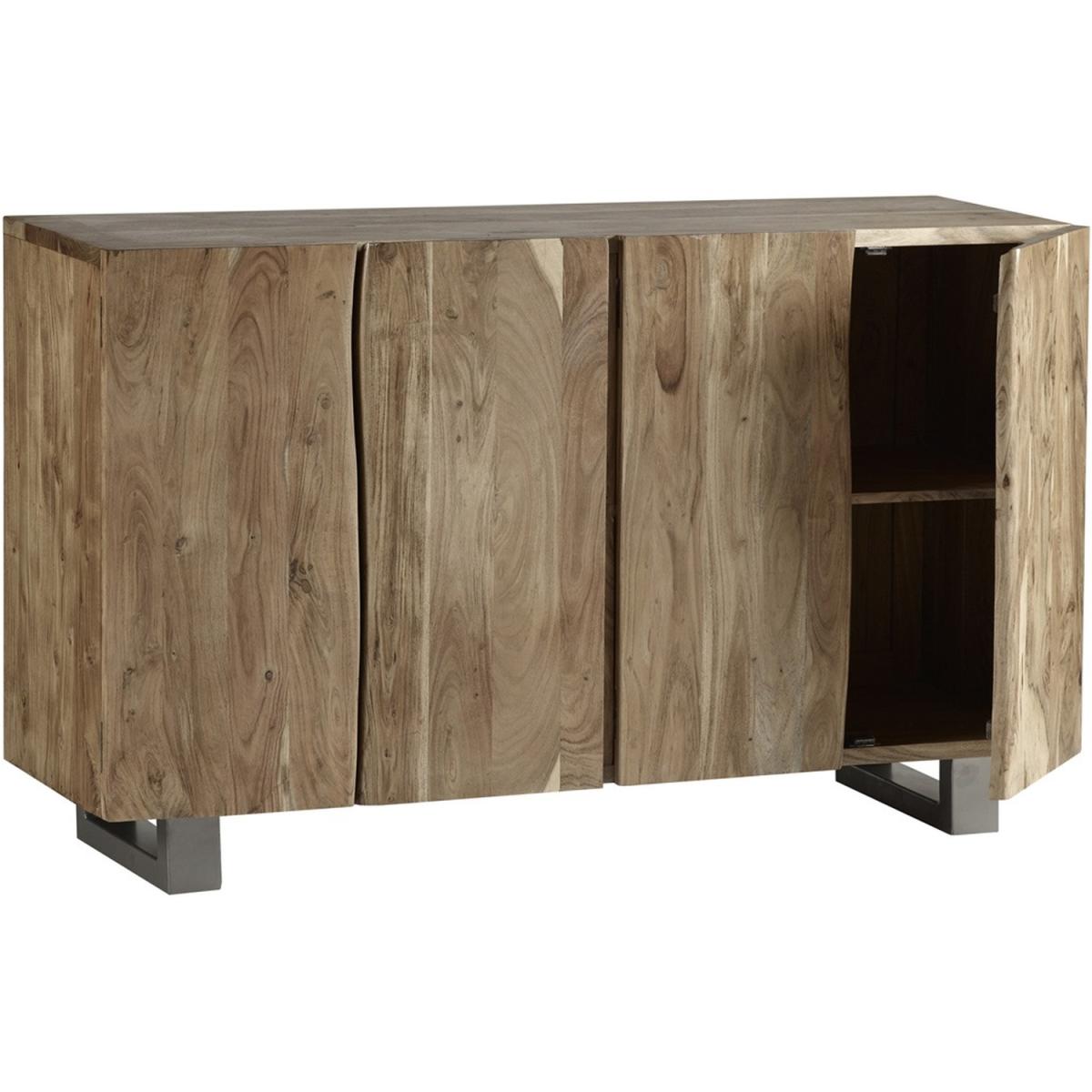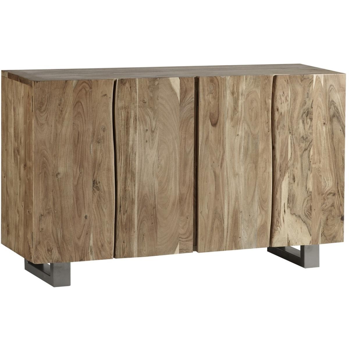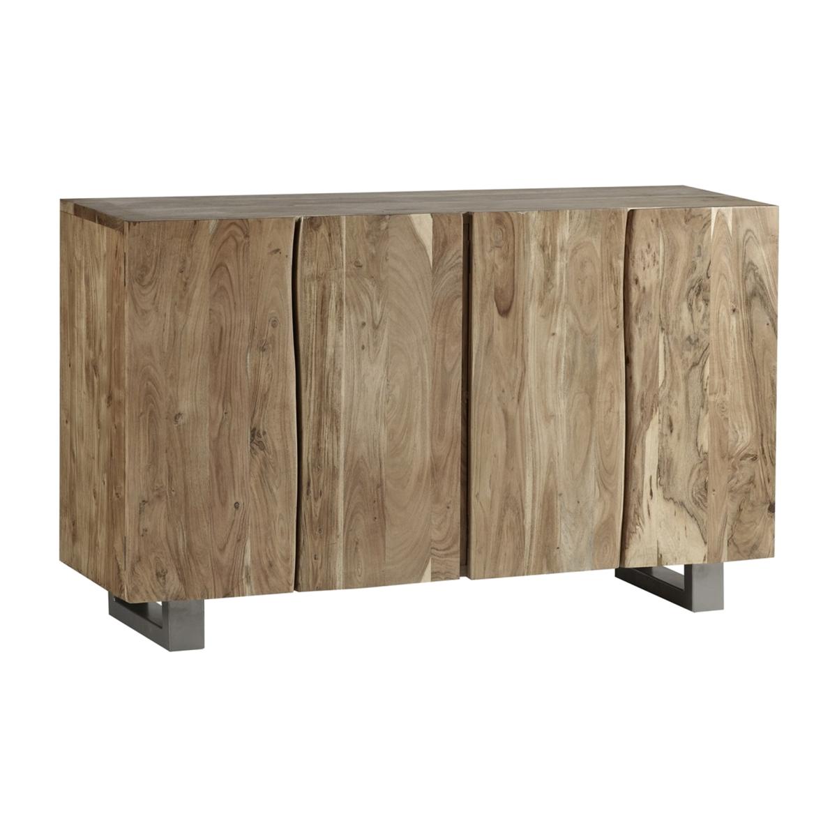 Modern and stylish large sideboard, handcrafted from sustainably sourced solid Acacia Wood, featuring 4 doors. It is offered in a natural wood colour with a matte finish and complemented with solid metal legs. The uniqueness of this range is given by the variations in the wood, together with the natural knots and slight cracks which add to the character and beauty of every piece.