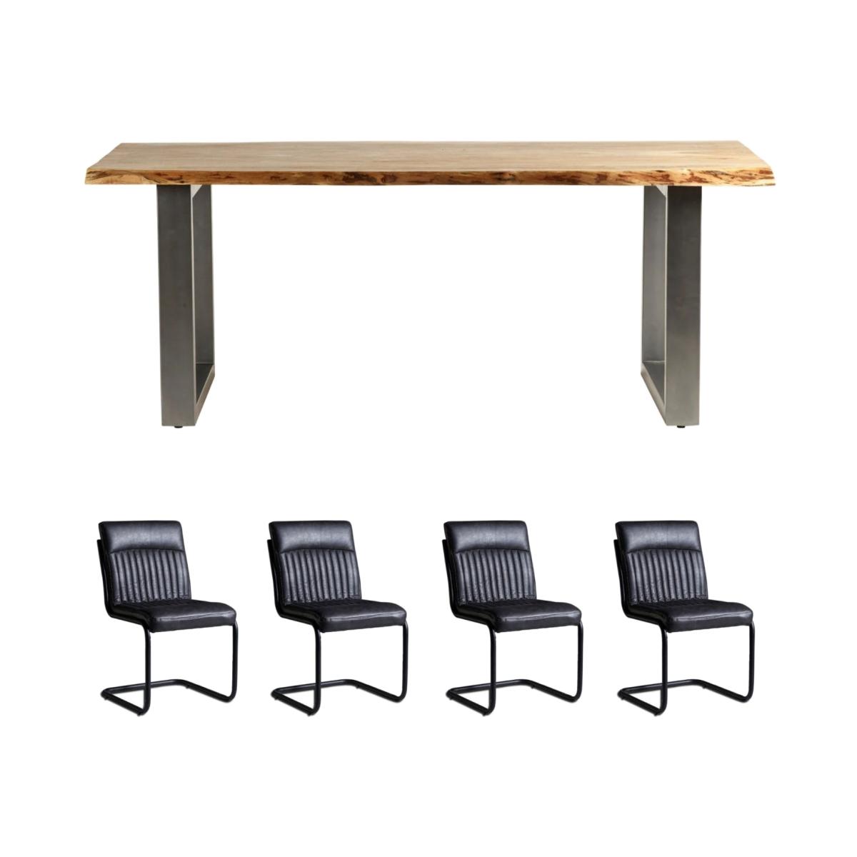 Boasting a stunning, handcrafted design made from sustainable Acacia Wood, the Natural Essential Live Edge Medium Dining Table Set is crafted with sophistication and style! The natural-wood table comes with a matte finish and solid metal base, plus four Industrial Style chairs with black powder-coated metal frames and dark grey PU leather padding.