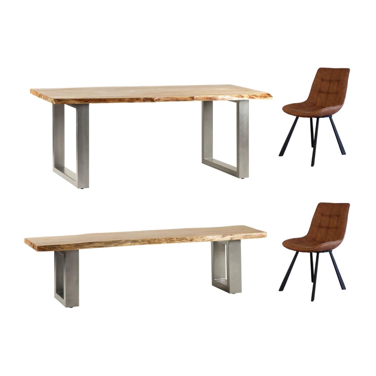 This Natural Essential Live Edge Large Dining Table Set is the perfect choice handcrafted from sustainable solid Acacia Wood, it features a matte finish and solid metal base. The two Industrial Style Chairs boast steel tapered tubes with black powder coating and a Light Brown Tan PU leather-covered seat. The natural wood-coloured Dining Bench with a matte finish also sports a solid metal base for a sophisticated look.
