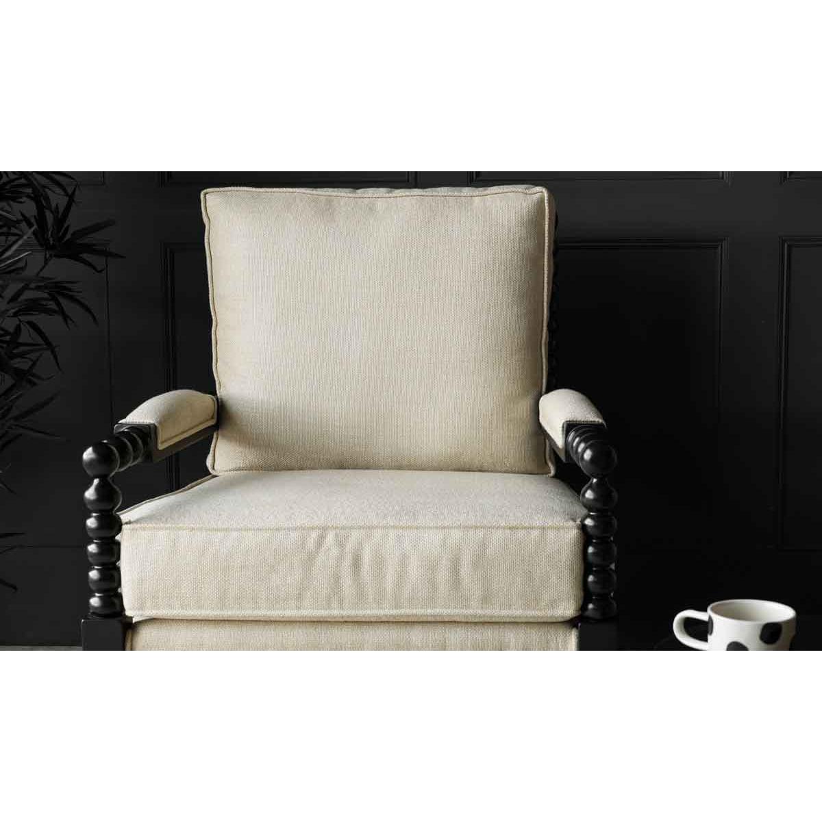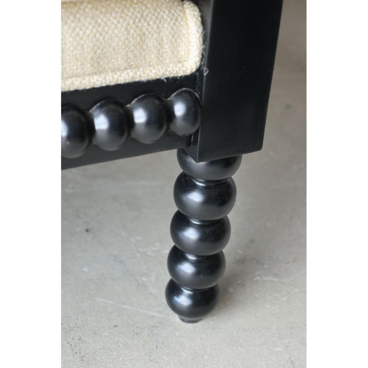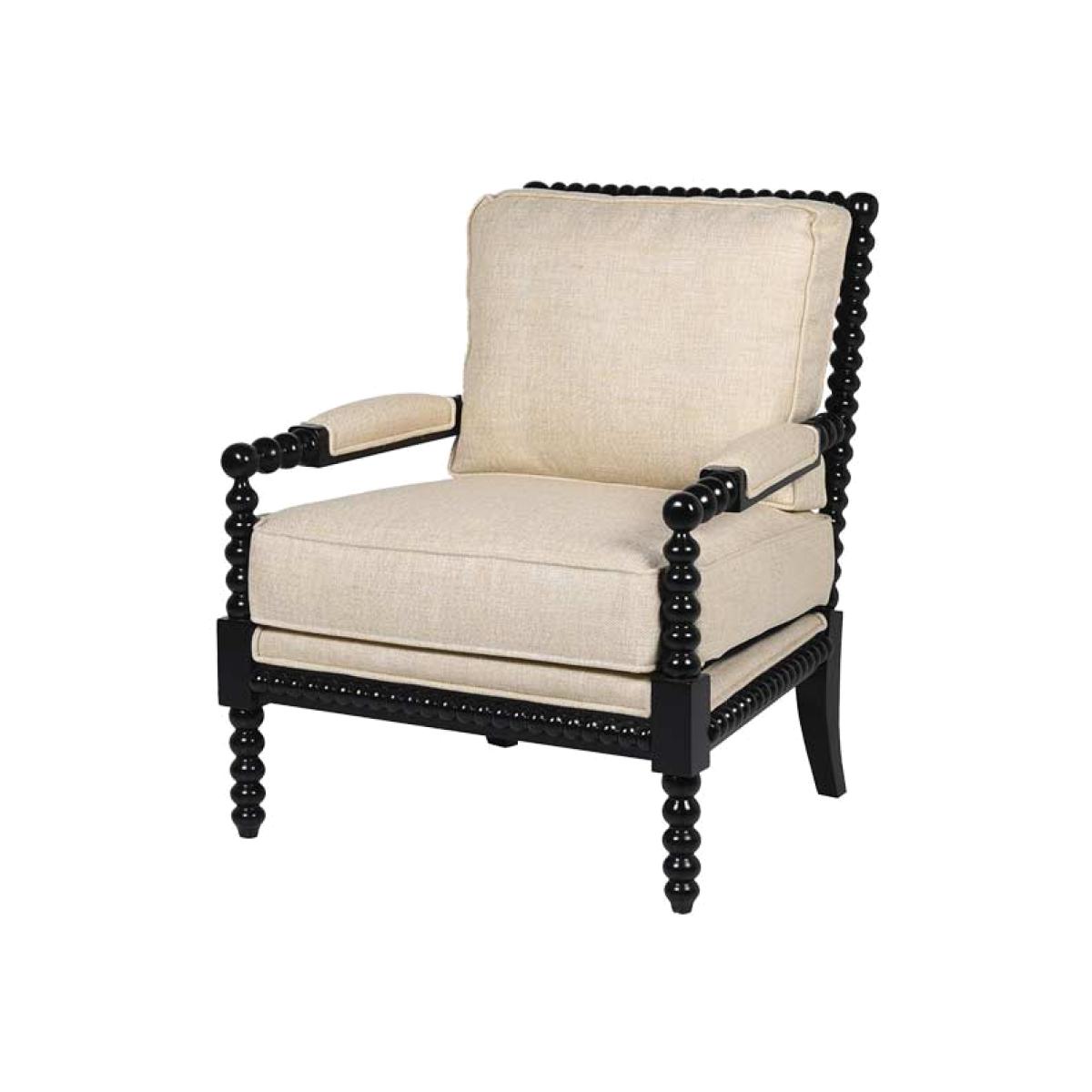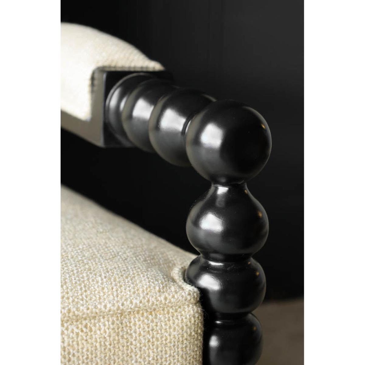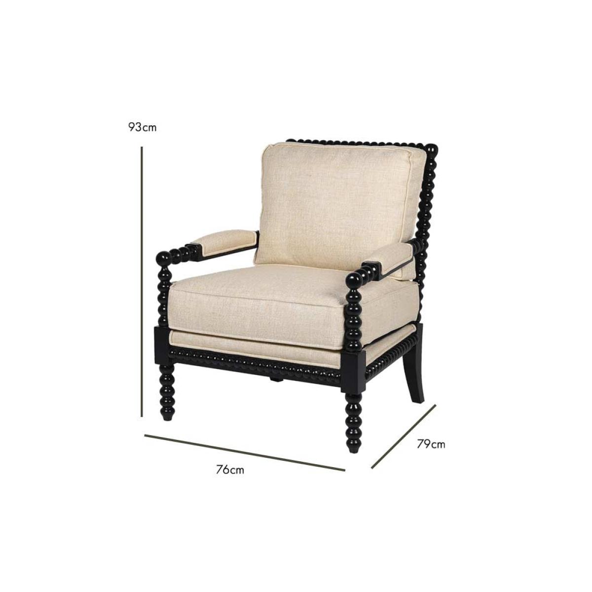 About The Natural Linen & Black Bobbin Armchair Introduce statement seating to your home with the beautiful Natural Linen & Black Bobbin Armchair. Made from mahogany, the bobbin detailing across the frame is paired with a bold black finish and gorgeous natural linen upholstery. Measuring 93cm in height, with a width of 76cm and a depth of 79cm, this chic occasional chair is destined to impress in any corner of the home. Why We Think You’ll Love The Black Bobbin Chair With Natural LinenFrom mirrors to art frames and furniture, the trend for bobbin detailing is having a serious moment in the world of interiors. Inspired by traditional wood furniture with a modern update, the black bobbin lounge chair creates a chic throne for relaxing in style. Ideal for monochrome lovers, the natural linen upholstery introduces a subtle take on the classic black-and-white colour palette that goes with everything! How To Style The Natural Linen Occasional ChairThe Natural Linen & Black Bobbin Armchair promises a fabulous feature in any room of the home. One of our favourite spots for this design has to be the bedroom as a beautiful bedroom chair that looks gorgeous against dark-painted walls and natural textures. Alternatively in larger living spaces, you could always style a pair of these lounge chairs together behind your coffee table for a luxe hotel look.