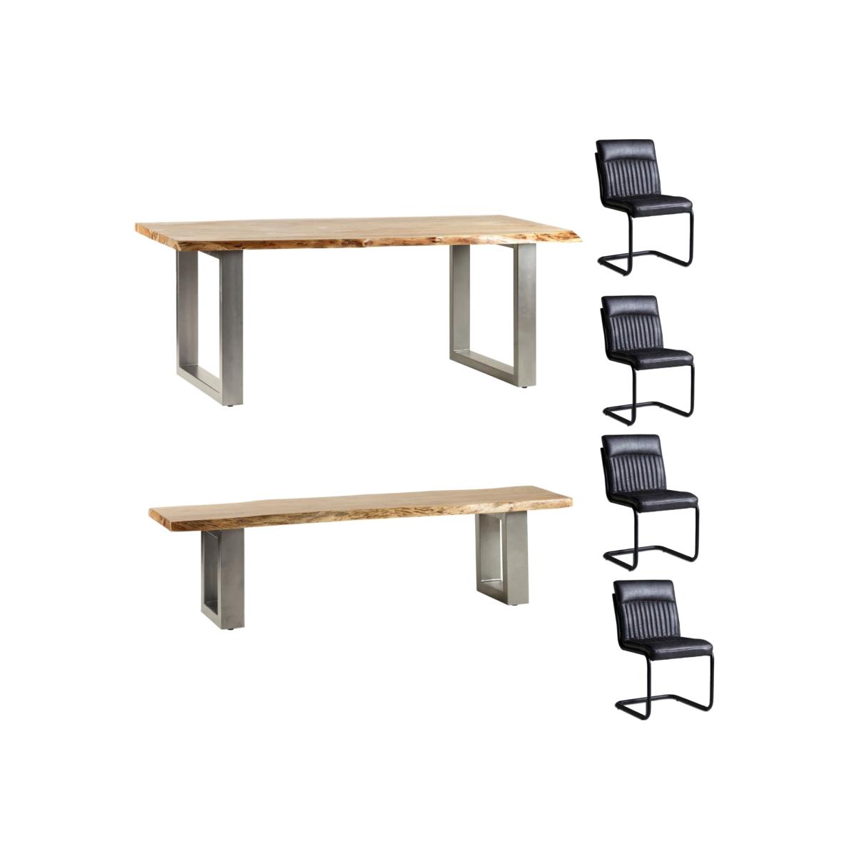 Our Natural Essential Live Edge Large Dining Table Set is an ideal choice for any home. The Table is crafted from sustainable Acacia Wood in a natural wood color with a matte finish, supported by a solid metal base. Completing the set are Industrial Style Chairs with black powder coated metal frames and padded seats in dark grey PU leather. The Large Dining Bench is designed to match the Table and crafted from the same sustainable Acacia Wood. Its metal base perfectly complements the natural wood color and matte finish.