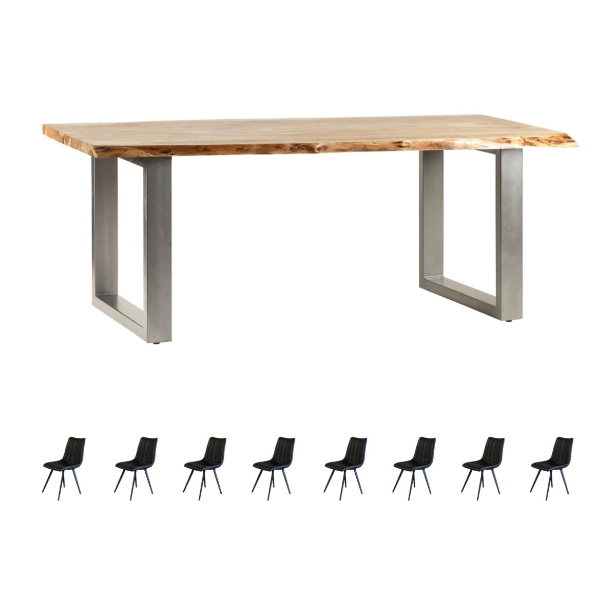 This Natural Essential Live Edge Large Dining Table Set is the perfect choice for your home! Handcrafted from sustainable sourced solid Acacia Wood, this set includes 1 table and 8 chairs, each boasting a modern, sleek aesthetic and simple yet elegant design. The table features a natural wood finish and solid metal base, while the chairs feature striking vertical accent stitching and a comfortable vegan leather seat. With room for up to eight people, your guests will be sure to feel cozy and relaxed at this table.