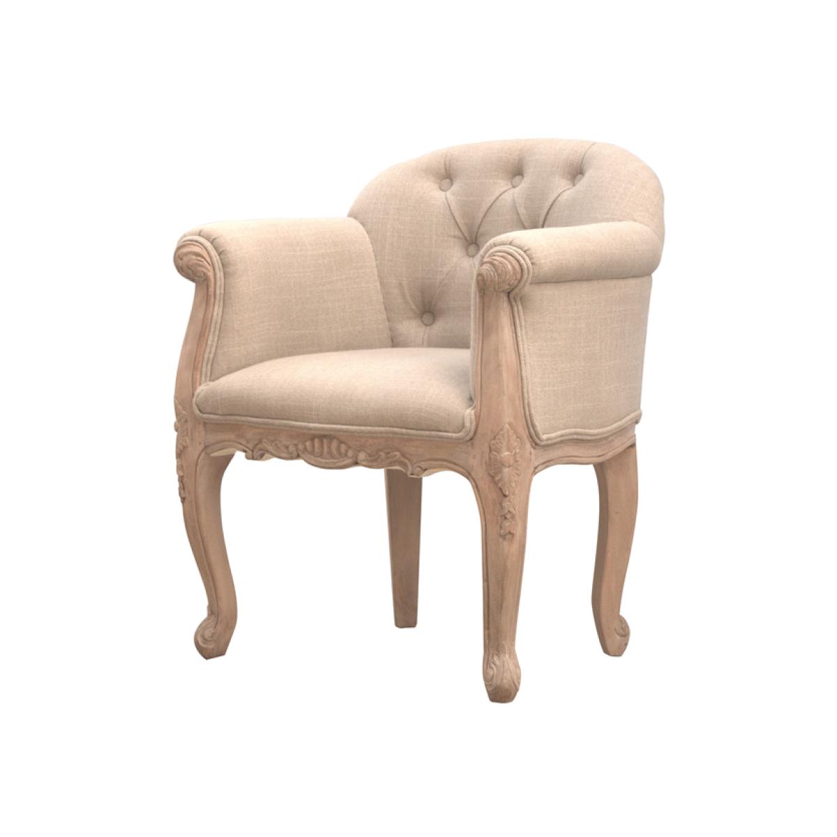 This stunning French-styled accent chair is constructed from 100% solid mango wood and upholstered in mud linen. Other features include 4 French-styled cabriolet legs which have a sun-bleached finish. This chair will sit beautifully, adding charm and elegance to any living space in your home.