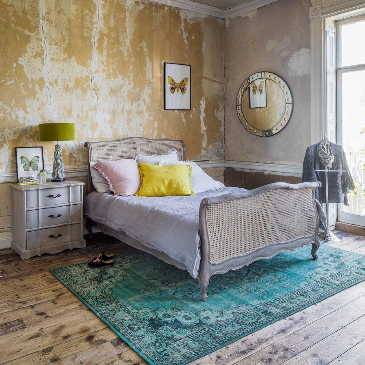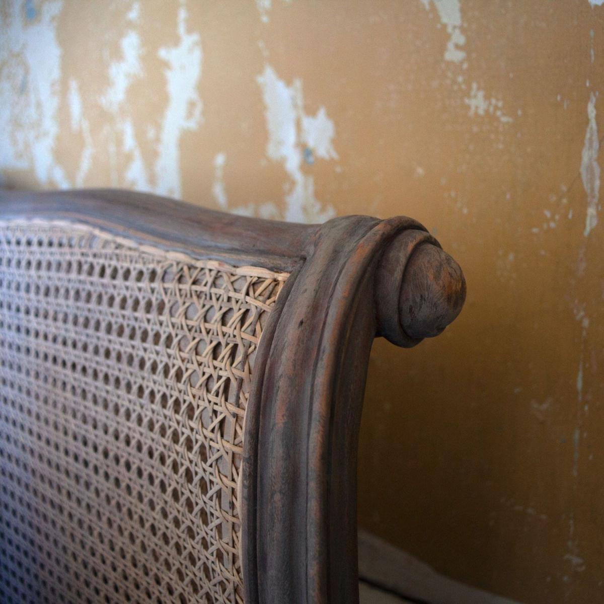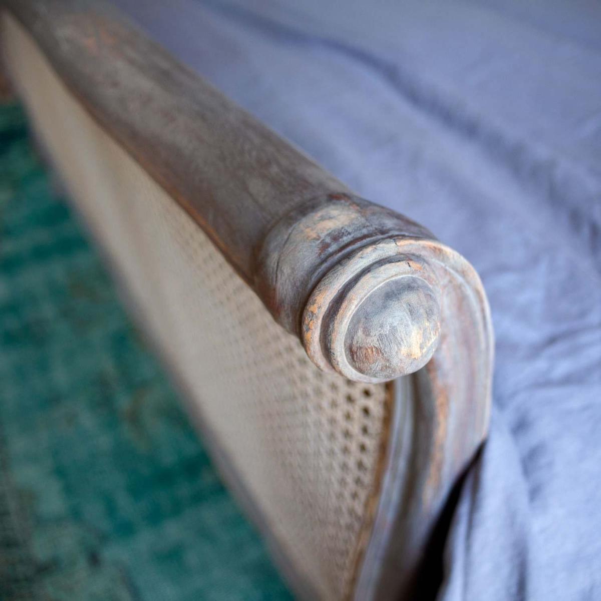 A French-inspired king size bed with an elegant carved wooden frame in a grey washed finish, cabriole legs and a cane headboard and footboard. The ideal place for a perfect night's sleep.