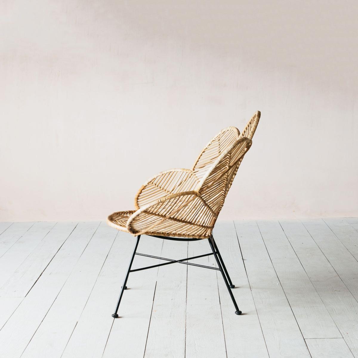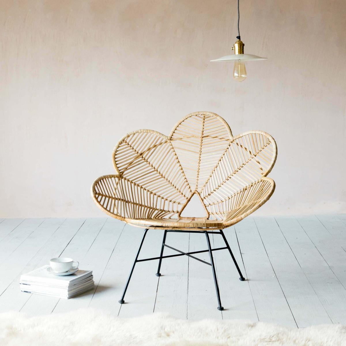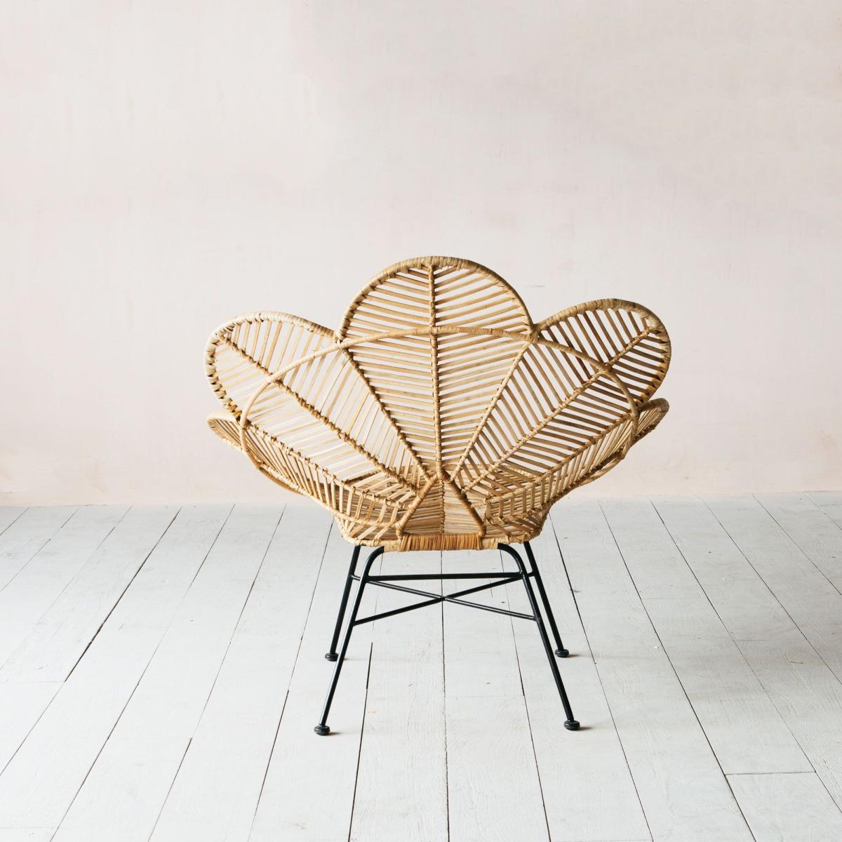 A contemporary twist on a classic rattan design, our peacock chair features a generous seat and wide back, shaped in a feather-inspired open weave design. Handcrafted in blonde rattan with black metal legs.