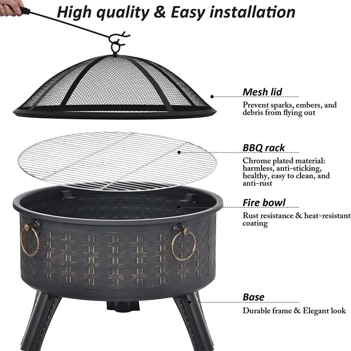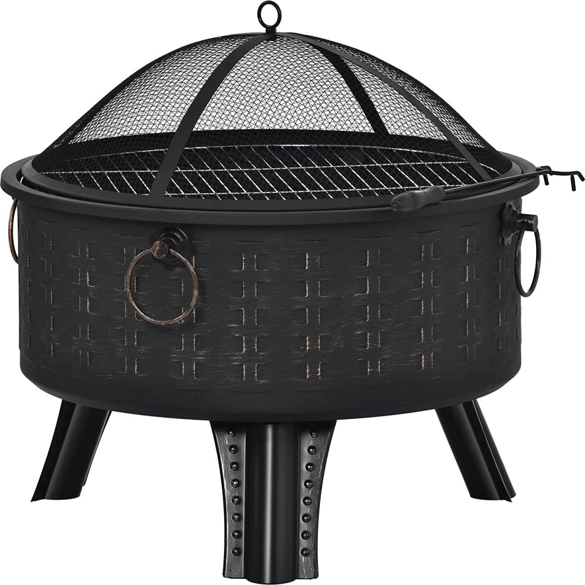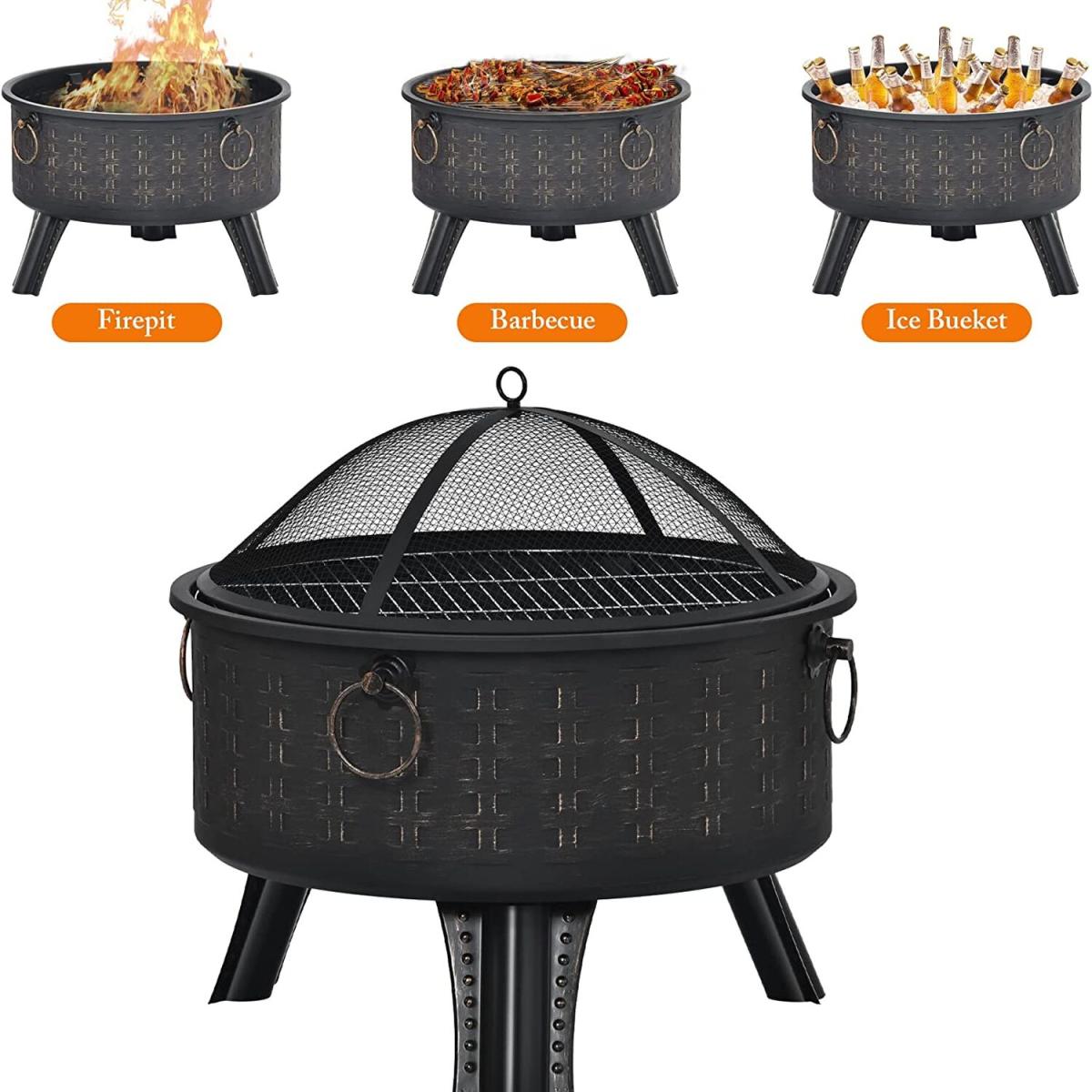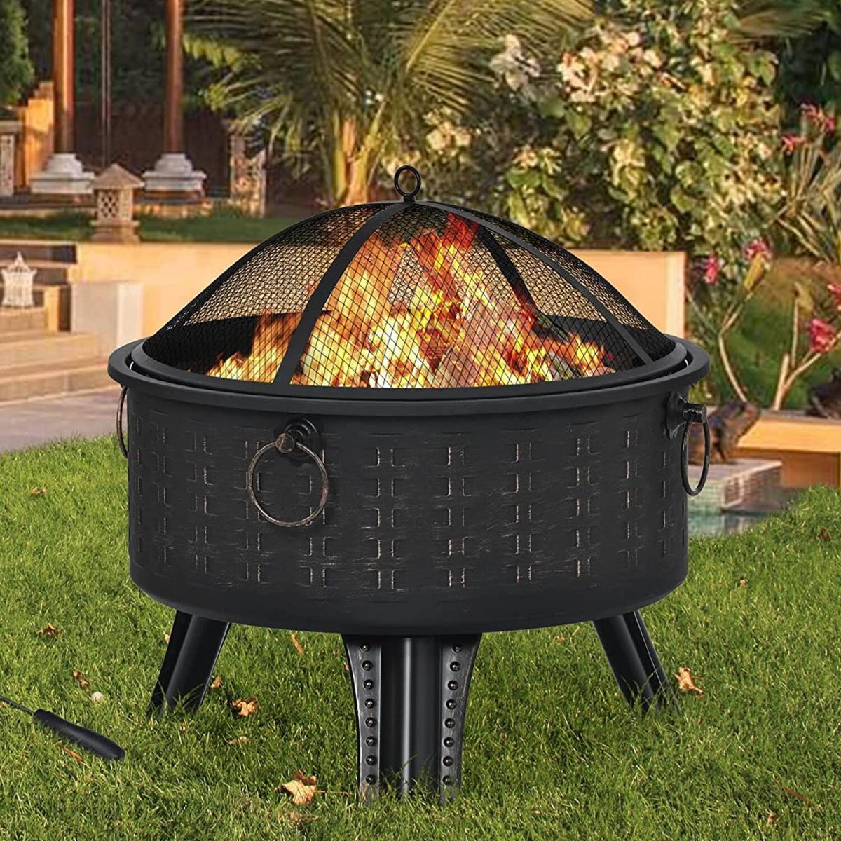 This round fire pit is available in matte retro color and stamped with a decorative rattan pattern, which will certainly be an eye catching piece in your yard. This kind of fire pit has the characteristics of weather resistance, large bearing capacity, durability, rust resistance, can be used for a longtime.