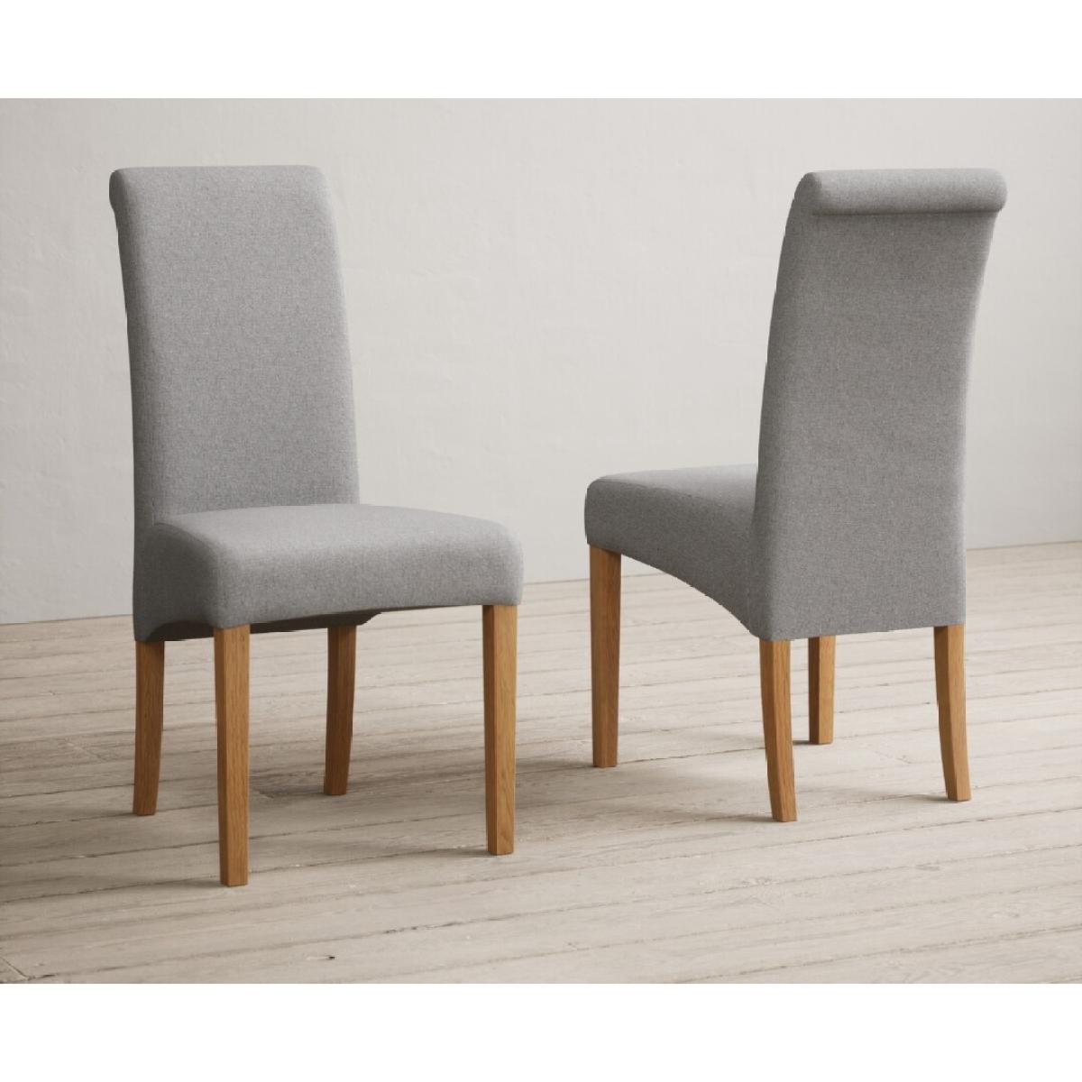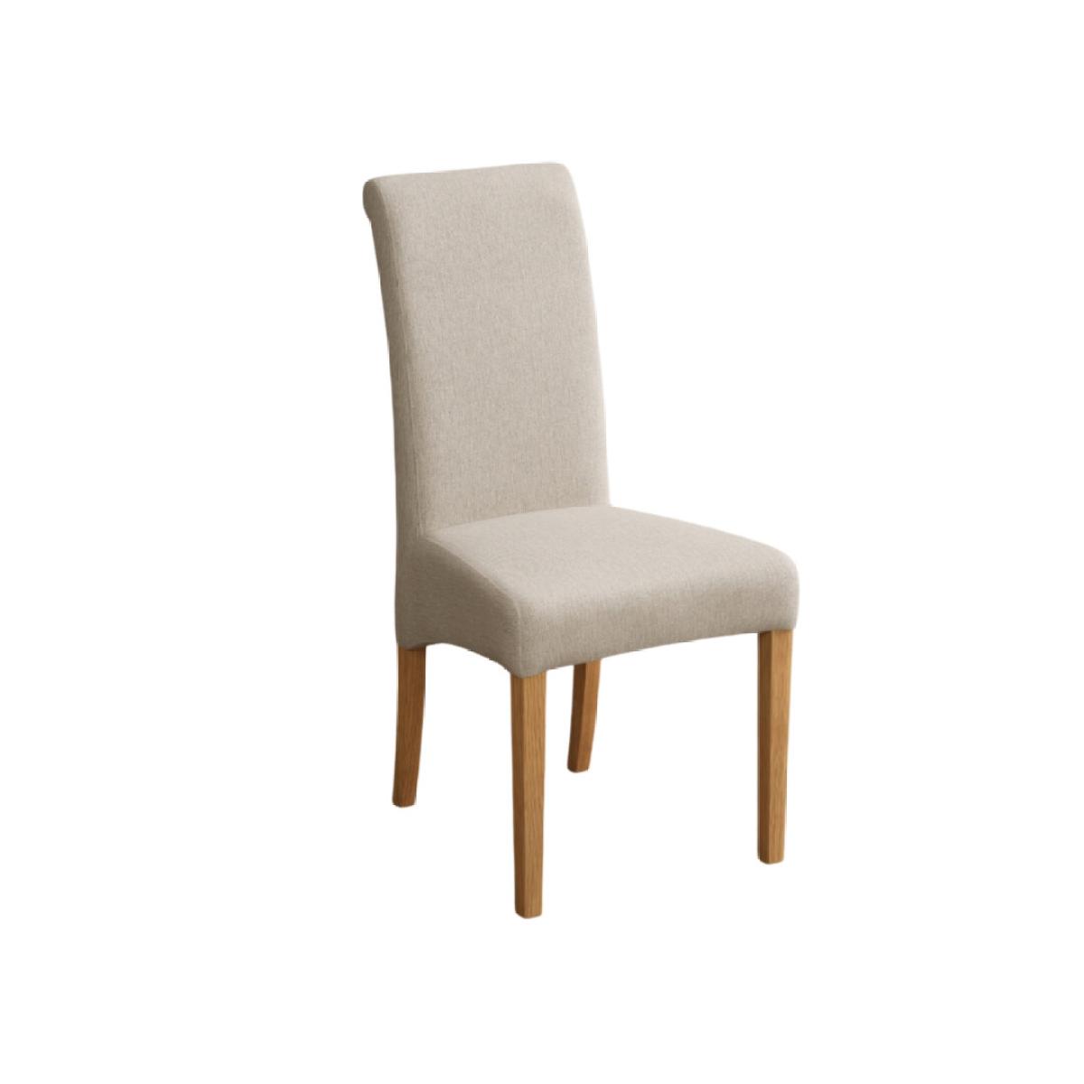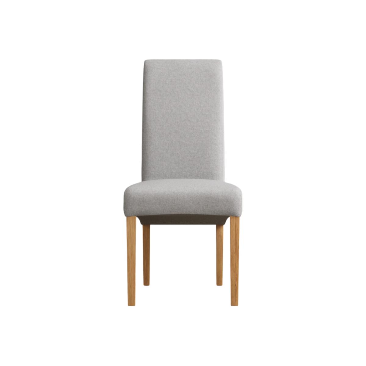 I’m a fan of these scroll-back chairs for their clean lines and subtle curves - the pale oak frame and neutral fabric slip into Scandi, contemporary or coastal schemes without fuss. They sit well around a bleached-wood table or next to a minimalist console in an open-plan space, keeping things light and airy. For styling, try layering a slim, textured cushion or a soft throw over the back to introduce colour and tactility. Group an odd number around your dining table for a relaxed, collected look, or mix with a slender bench on one side for an eclectic touch. Their narrow profile also makes them ideal for tighter nooks or home-office seating.