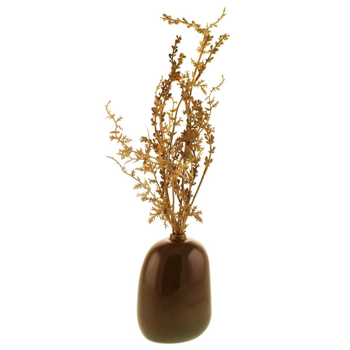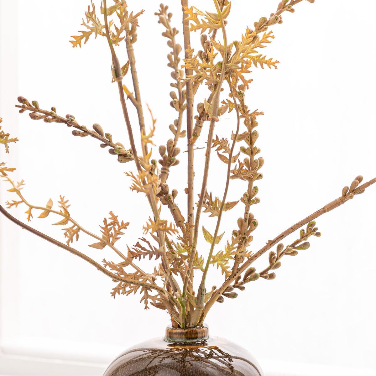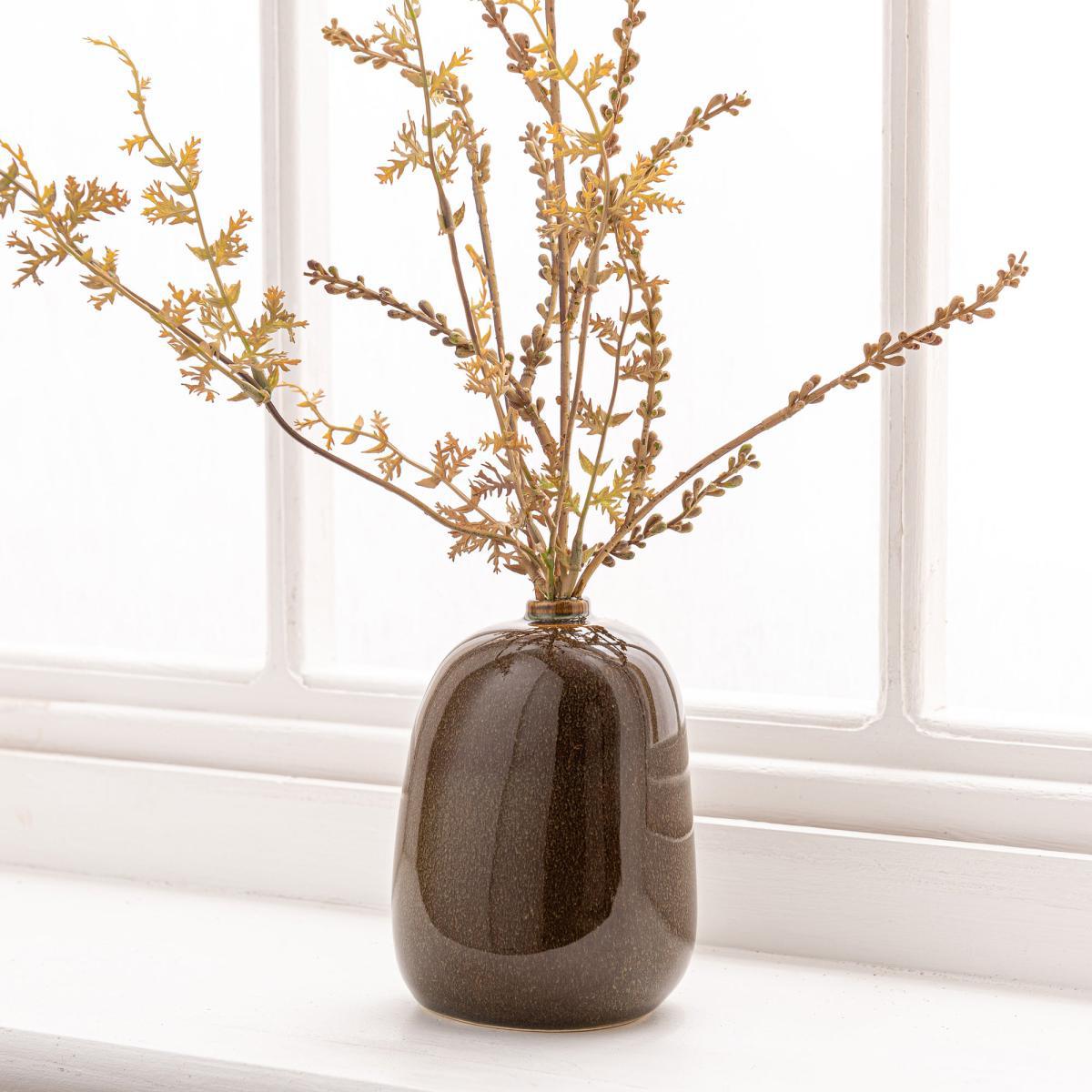 This contemporary seed spray arrangement in a ceramic, asymmetric vase with a reactive glaze design has a natural look and design that is ideal for displays on shelves, sideboards and tables.