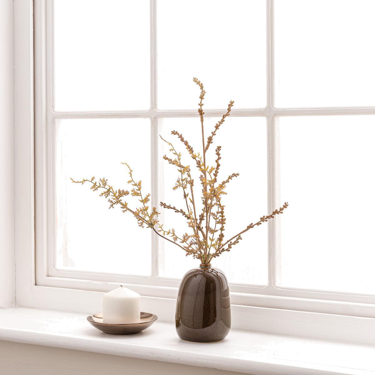 I love this sprig for its understated elegance and versatility. It works particularly well in minimalist or modern interiors, adding a natural touch without overwhelming the space. The neutral tones of the seed spray and ceramic pot mean it can slot seamlessly into various colour schemes, whether on a windowsill, coffee table, or sideboard. When styling with this piece, consider pairing it with other natural materials like wood or stone to create a cohesive look. A handy tip is to use a few in different sizes for a styled vignette, or group multiple arrangements together for added visual interest. Its low-maintenance nature makes it perfect for those who want the beauty of botanicals without the fuss of real plants.