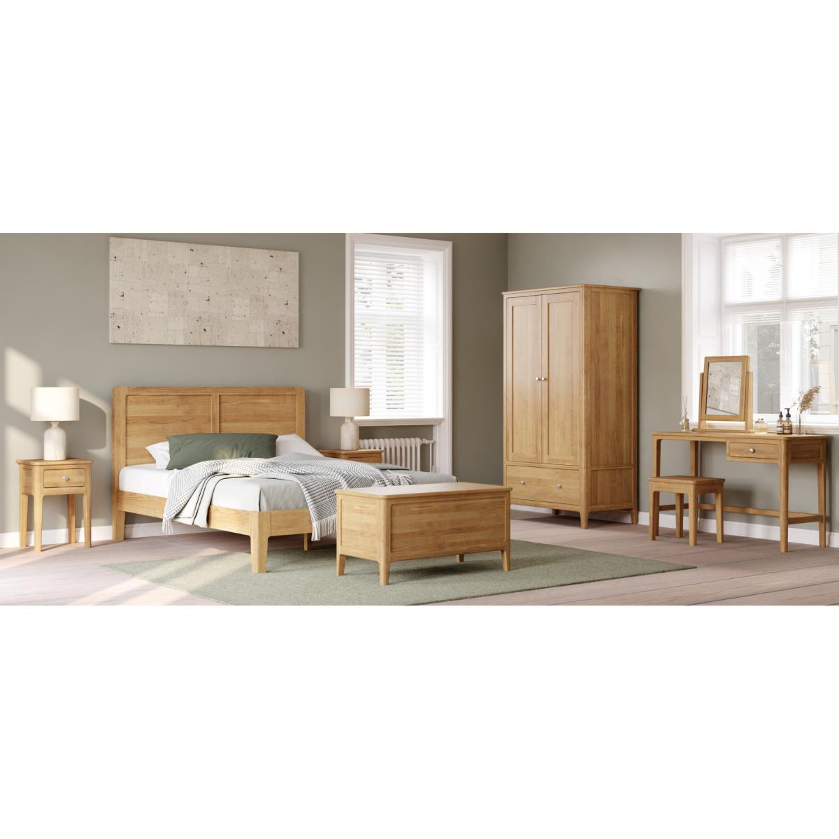 I love this natural solid oak dressing table mirror for its timeless simplicity and versatile appeal. Its clean-lined design complements both classic and contemporary interiors, making it a flexible addition to various bedroom décors. The natural oak finish brings warmth and texture, perfect for creating a cosy, inviting space. For styling tips, consider pairing it with other oak or wooden furnishings to create a cohesive look, and add soft lighting around the mirror for functional yet elegant illumination. This piece works particularly well in light and neutral colour schemes, but it can also serve as a grounding element in more eclectic or layered styles. Its understated design also makes it a functional focal point without overwhelming the space.