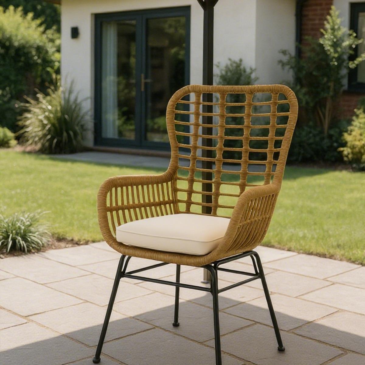 Natural Woven Garden Chair with Cushion for Balcony, Patio or Conservatory Upgrade your garden or patio with this stylish Rattan Chairs, perfect for both dining and relaxing outdoors. Featuring a natural rattan-effect finish and a sleek, modern shape, it adds a touch of elegance to any setting. The strong steel frame and PE rattan weave offer long-lasting durability while keeping the chair lightweight and easy to move. Its compact size (W56 x D57 x H87cm) makes it ideal for small spaces, balconies, or as part of a larger dining set. Easy to clean with just a damp cloth, this chair is low-maintenance and built to withstand outdoor use. Whether you're hosting guests or enjoying some quiet time outside, this chair offers both comfort and style all year round.