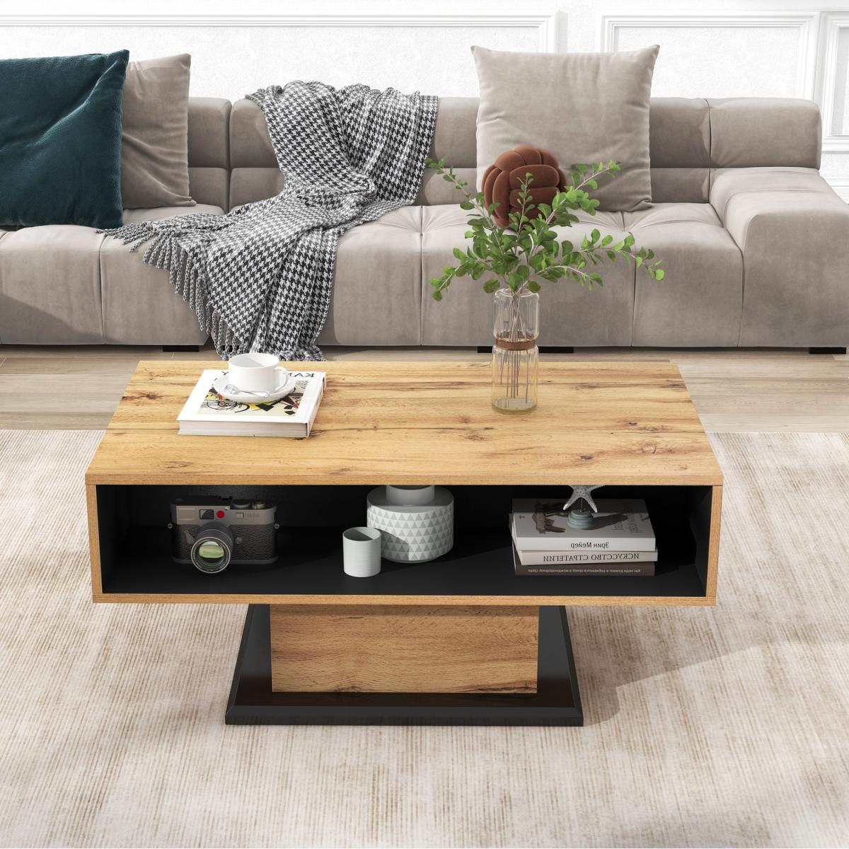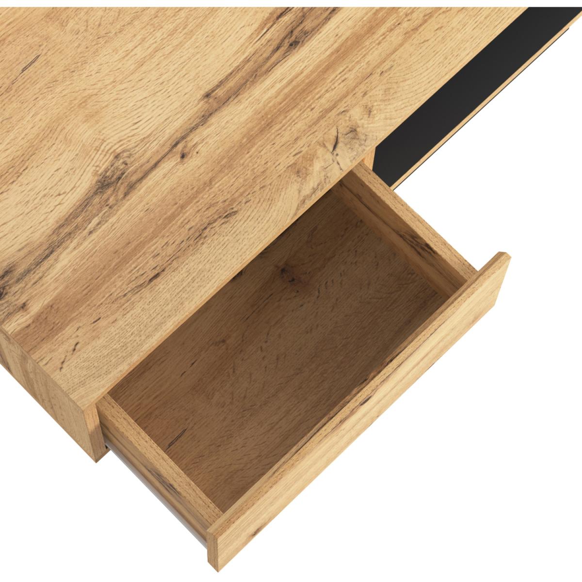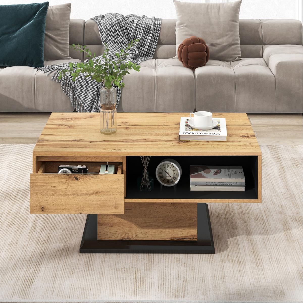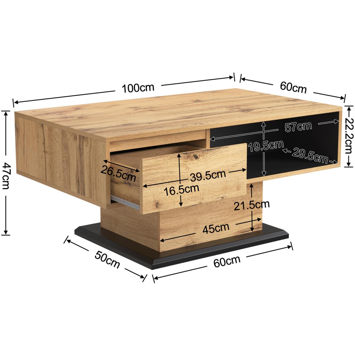 This coffee table is made of high-quality material chipboard, melamine, which is strong and reliable, and the finish is oak wood grain, which is delicate and textured, so that your living room is not monotonous and repetitive. There is a drawer inside the product, with front storage compartment and rear storage space to meet your multiple storage needs. The linear forms of the impress with their simplicity and elegance, which can be harmoniously integrated into different furnishing styles. There are no handles on the front. But the panels are designed to be used as recessed grips. Overall dimensions 100 x 47x 60 cm, Weight capacity60 kg, Colour oak grey black, Main material Particle Board.