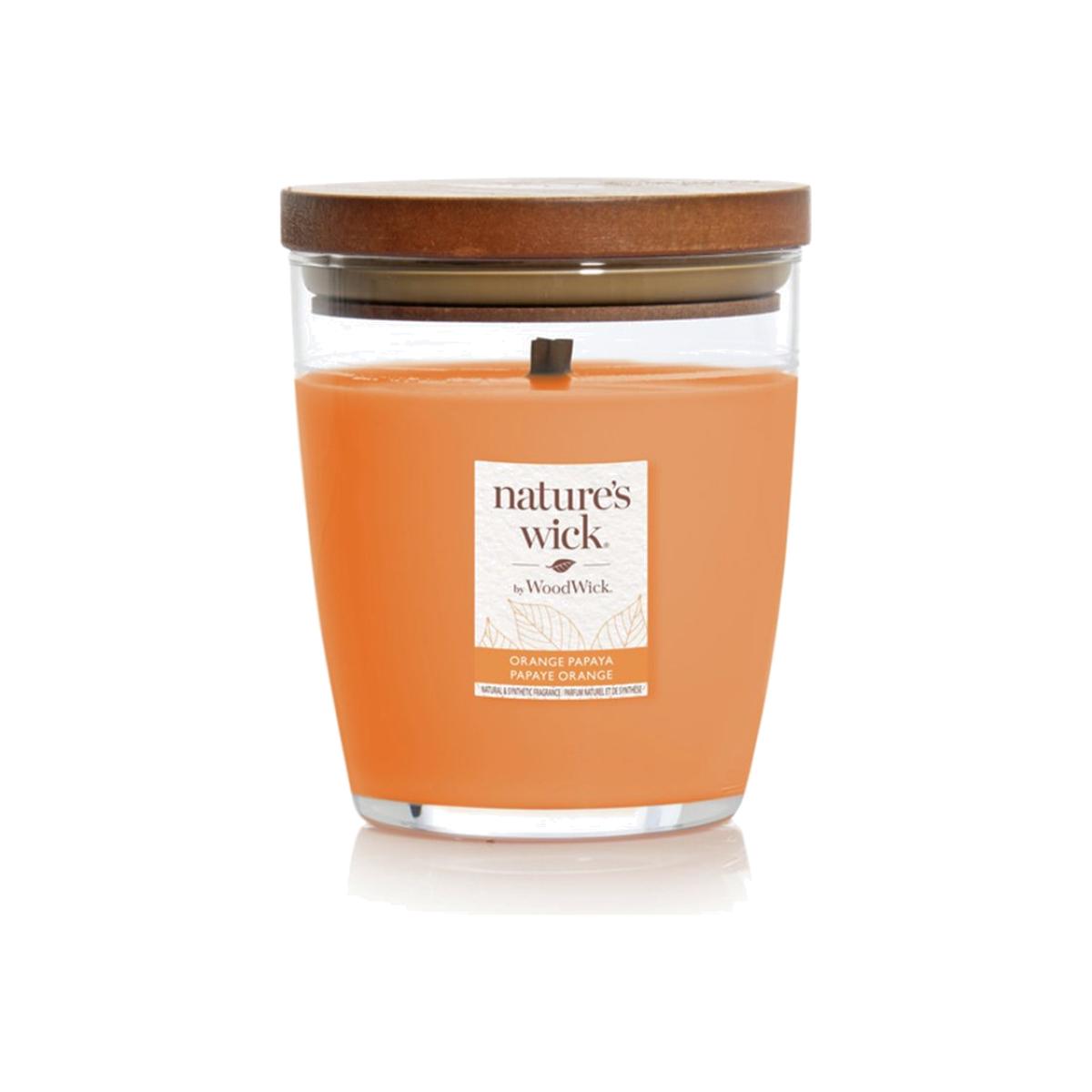 Reward your senses with fragrances inspired by nature with Nature's Wick. A natural wooden wick with patented Pluswick Innovation fills your home with premium fragrances and a crackling sound. Nature-inspired fragrances, blended with essential oils. Stylish tapered glass candle and wood style lid blends seamlessly with any decor. Orange Papaya scent. Soy wax. Size H11.3, W9.4, D9.4cm. Diameter 9.4cm.