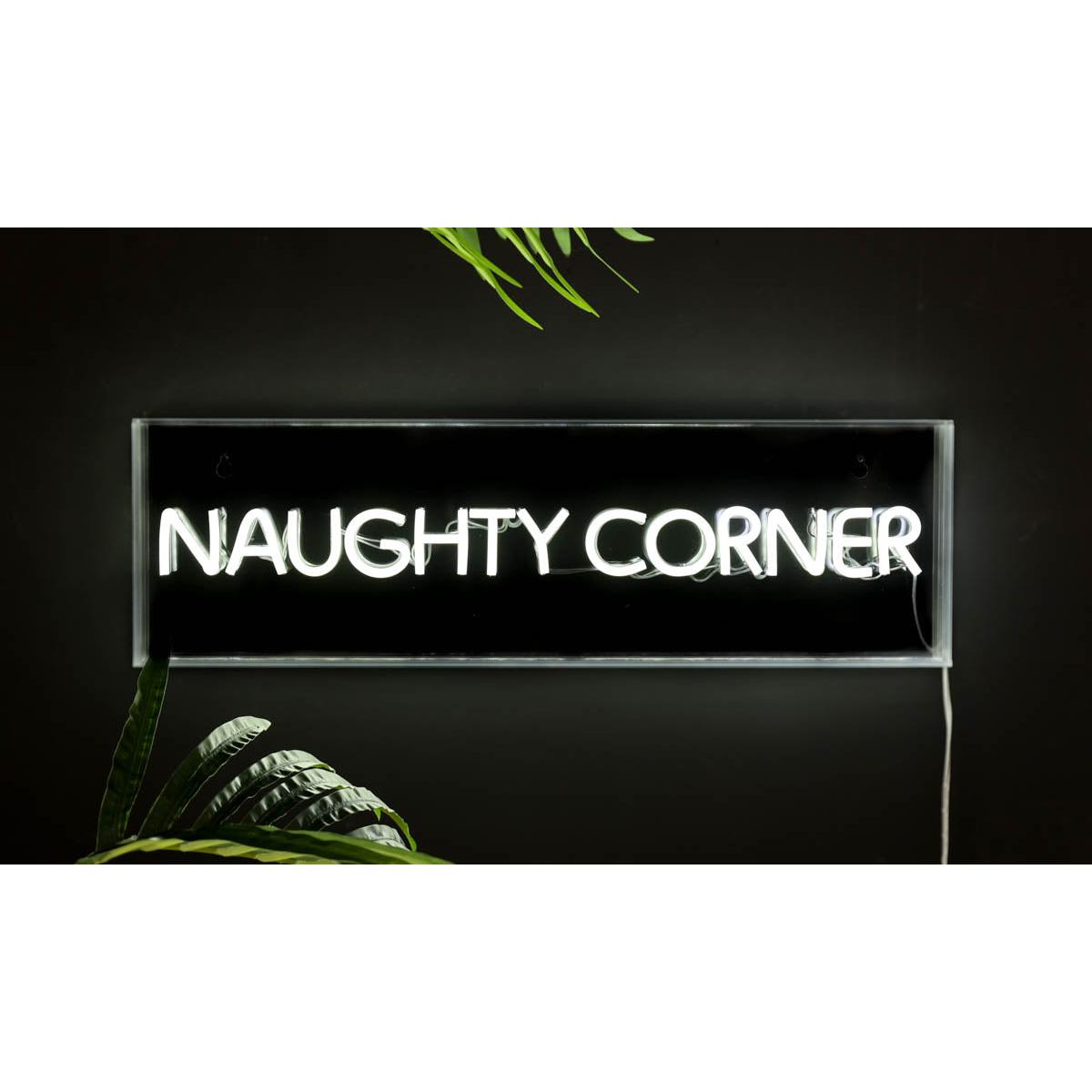About The Naughty Corner LED Neon Acrylic Light Box The Naughty Corner LED Neon Acrylic Light Box is the perfect piece to celebrate your wild side. The light box itself is made of acrylic, with ‘Naughty Corner’ shown in white LED neon light. Measuring 15.24 x 50.8cm, the neon sign comes with a 1.75m USB cable and has a handy dimmer switch. Please note that a USB compatible plug will need to be sourced separately. Why We Think You’ll Love The Naughty Corner Neon Light Neon lights have become a staple lighting feature in our homes. Celebrating how many of the best moments come after dark, a neon light introduces personality to any space and helps to create the perfect party atmosphere. Designed to be hung on the wall or propped up on a shelf, this quirky neon sign can be styled anywhere. How To Style The Naughty Corner Neon Sign One of our favourite spots for the Naughty Corner LED Neon Acrylic Light Box has to be by the home bar to reinvent the idea of the naughty corner into the ultimate at-home happy hour destination. Alternatively, why not hang the light on the wall as a piece of cheeky neon art in the bedroom? With a lifespan of approximately 20,000 hours, this neon wall sign promises hours of naughty fun.