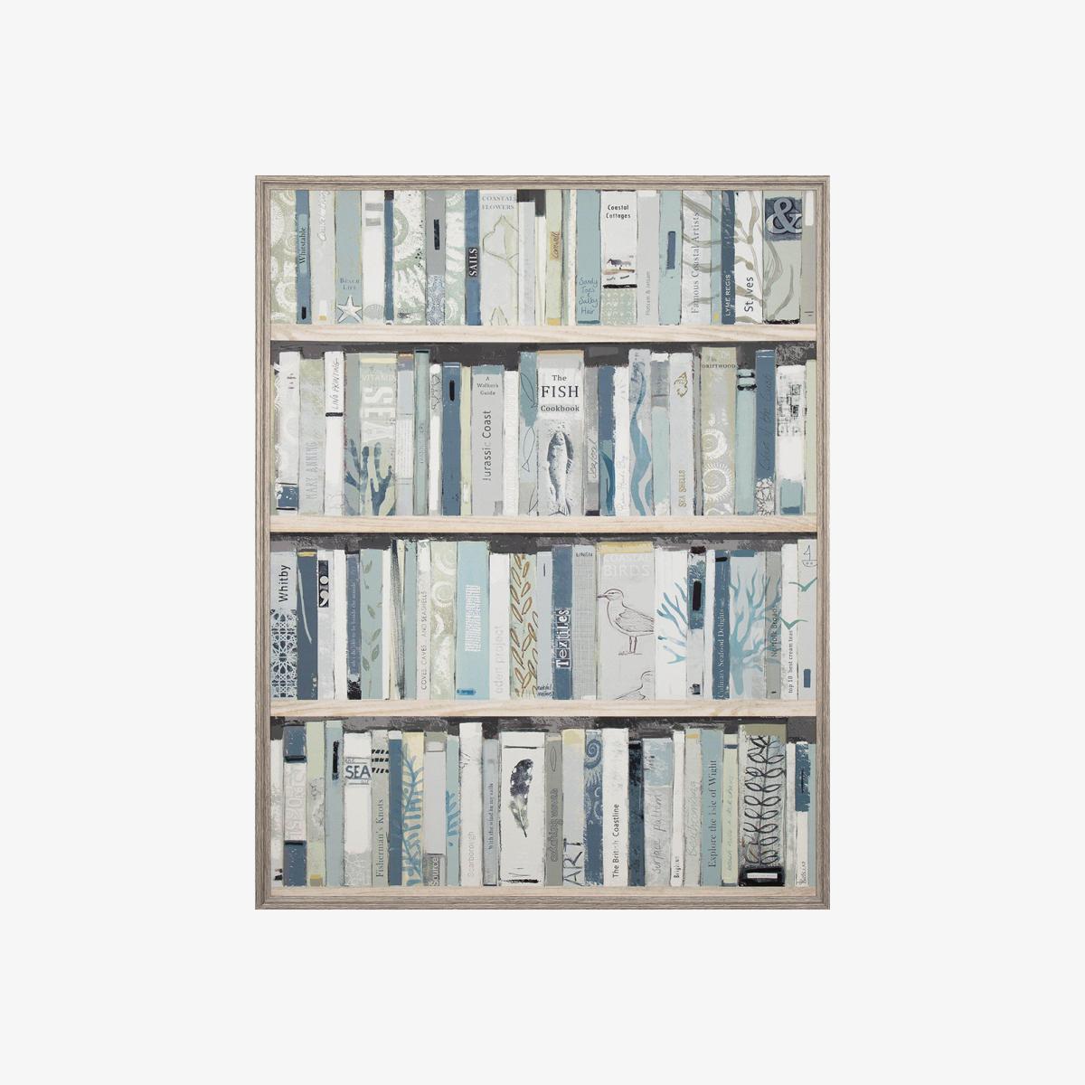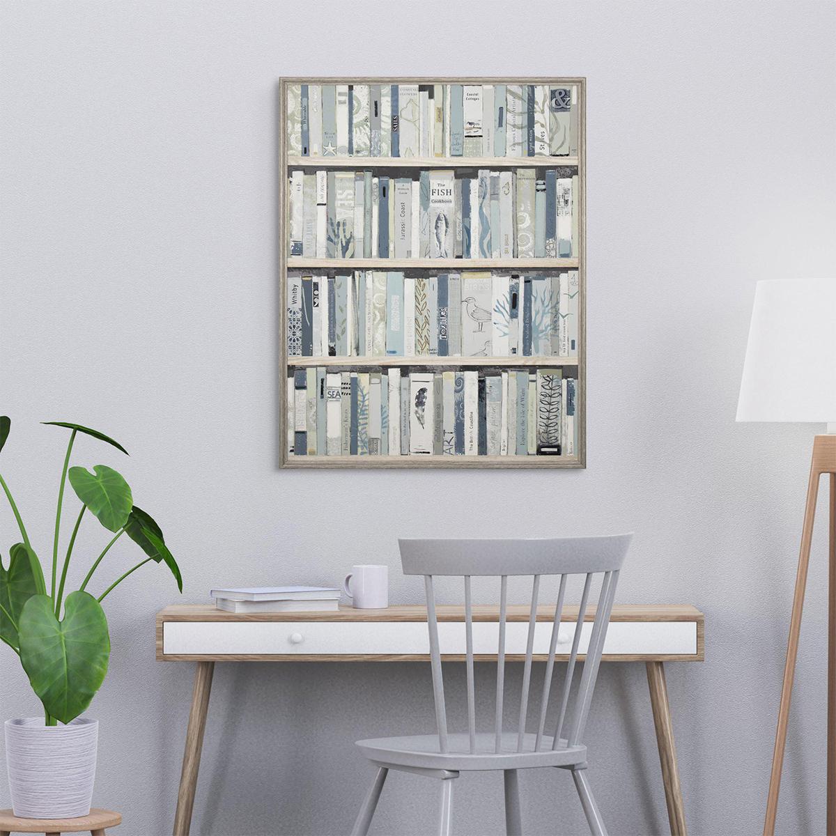 Crafted with meticulous attention to detail, this artwork features a bookshelf filled with nautical inspired novels, with each spine rendered with intricate illustrations. Whether displayed in a cosy reading nook, a living room or workspace.