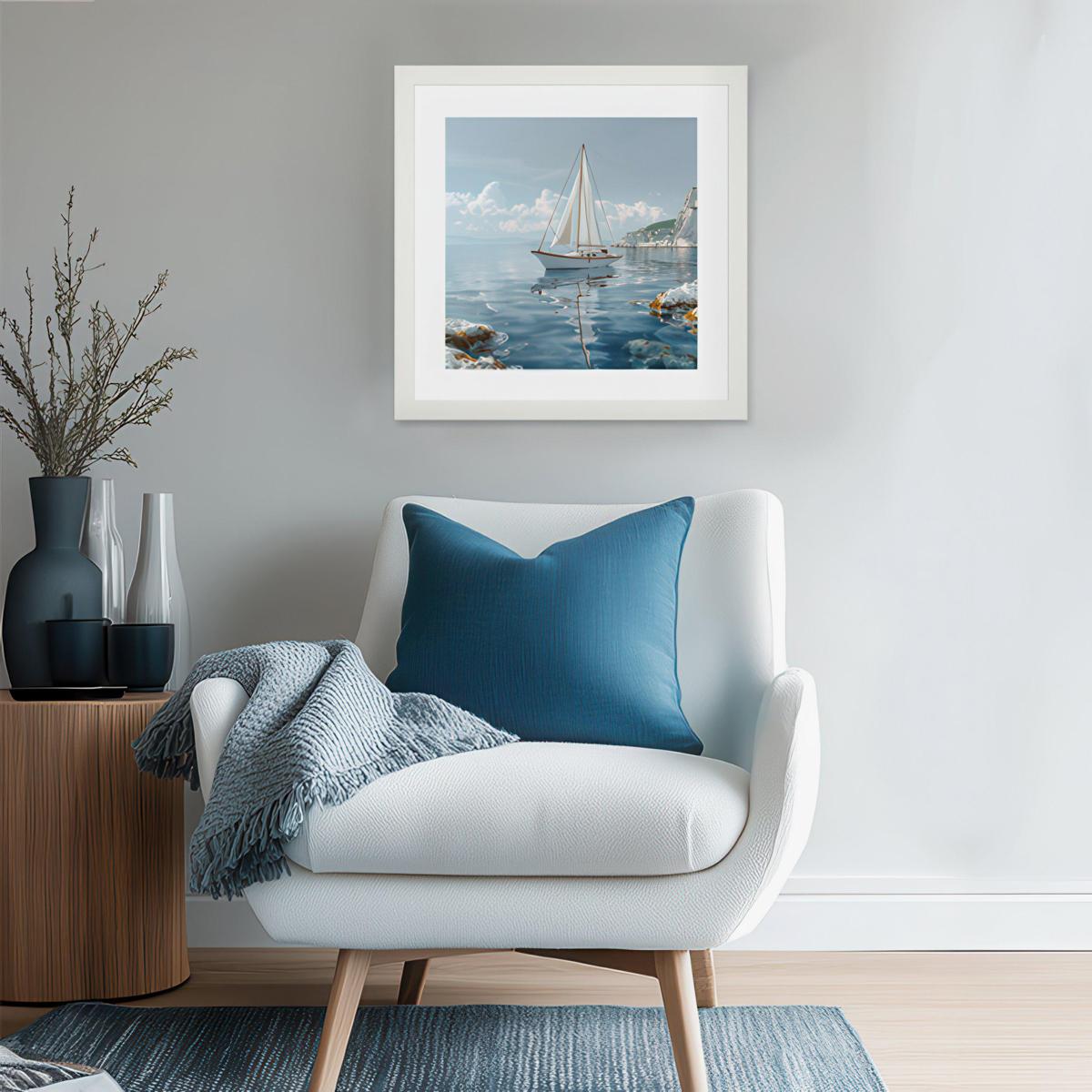I love this boating scene because of its calming colour palette and timeless appeal. It works particularly well in coastal or nautical-themed interiors, bringing a touch of seaside tranquillity indoors. For styling, consider placing it above a neutral sofa or mantelpiece to serve as a calming focal point. Pair with natural textures like driftwood or linen to enhance the maritime vibe. Practical tip: since it's a framed piece, opt for simple, understated surrounds to keep the focus on the artwork itself, and ensure it's hung at eye level for optimal viewing. This piece is versatile enough to work in living rooms, bedrooms, or even a bathroom in a coastal retreat.