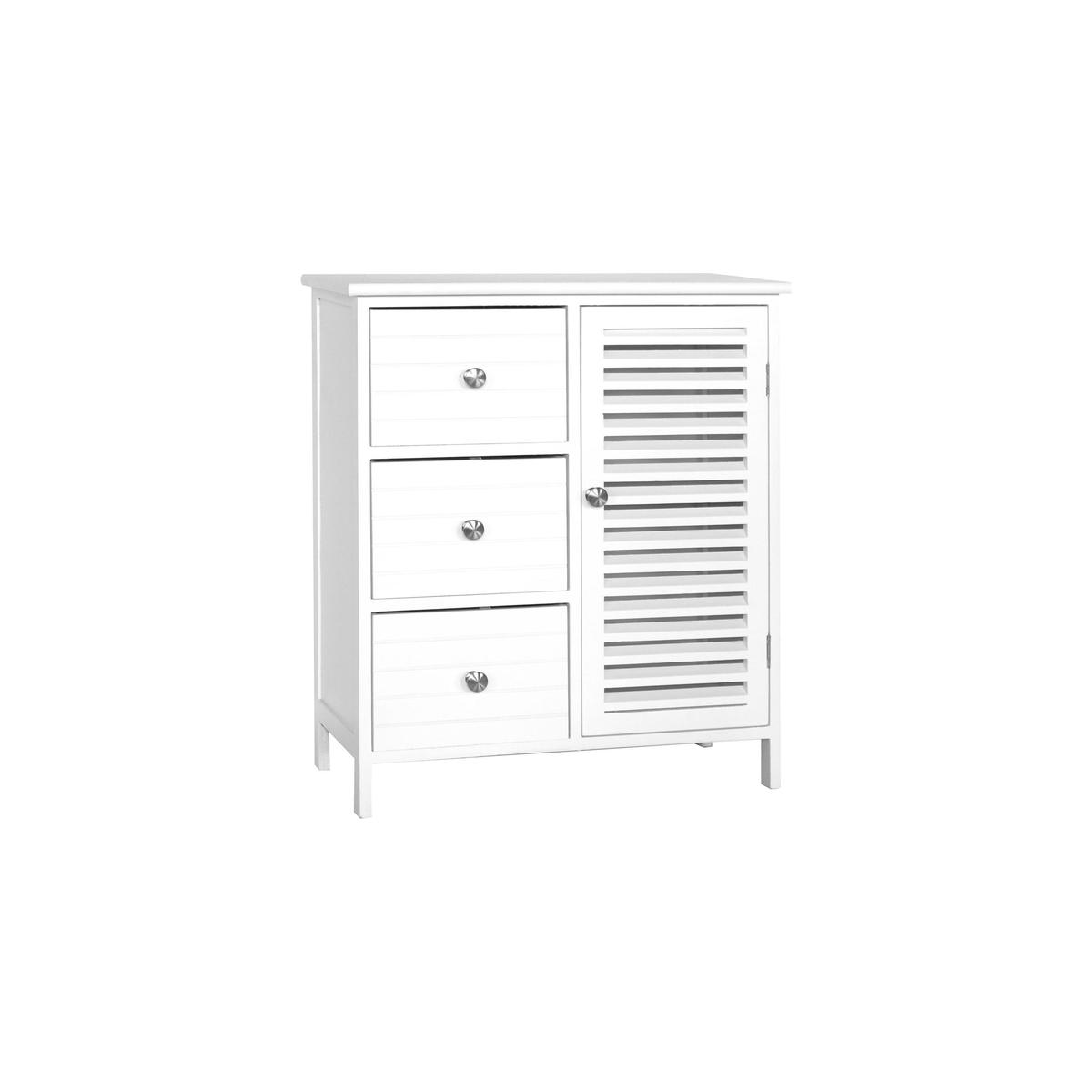 Crafted from paulownia wood with a slatted design, this nautical drawer and cabinet unit is finished in white and features nickel handles.