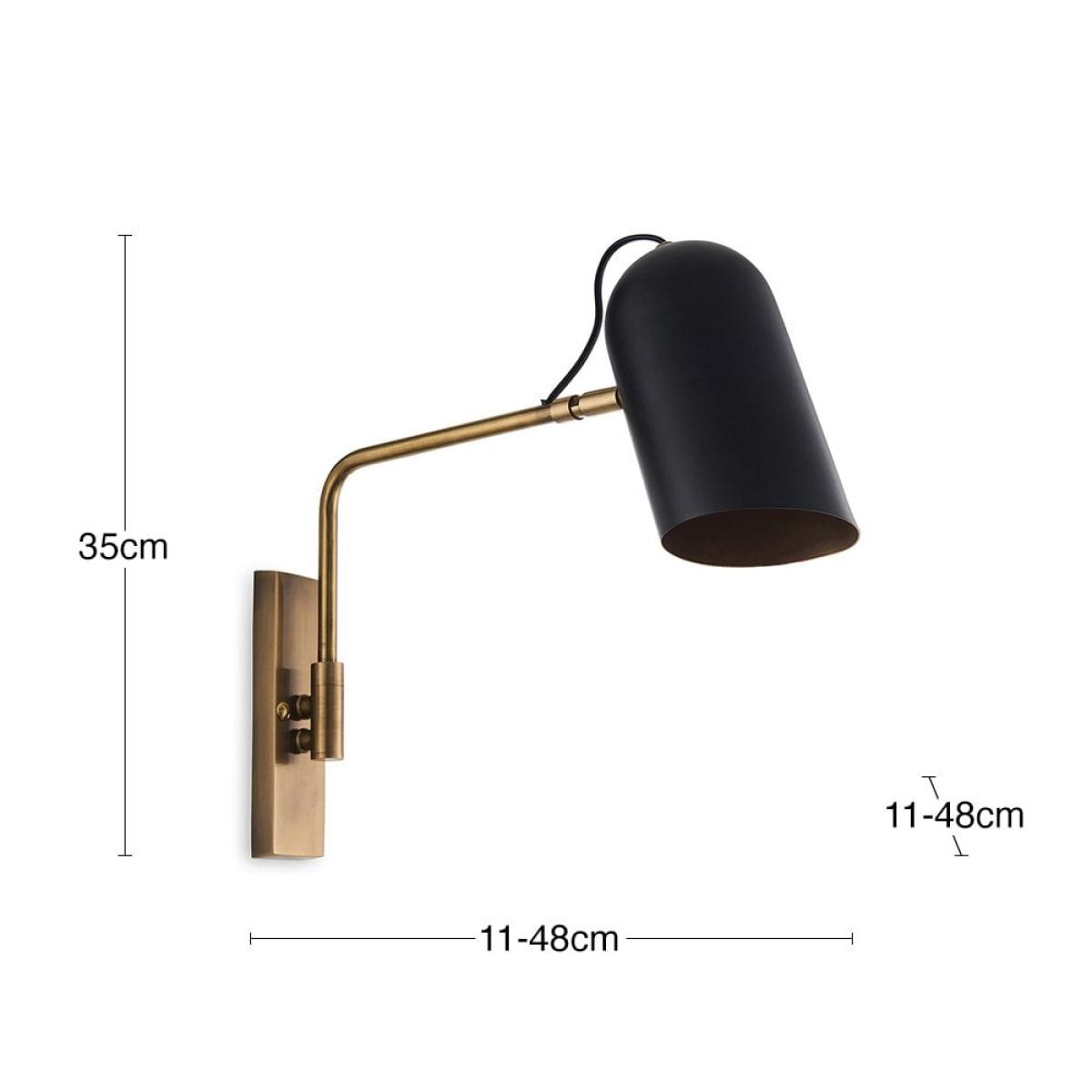 Upgrade your space with the Navren Wall Light in black and vintage brass. This modern minimalist masterpiece is more than just a light - it's a design statement that adds industrial modern style to any room. Featuring a sleek matte black shade with a captivating brass interior, this light creates a stunning contrast that catches the eye. The antique brass stem and wall fixture, adorned with knurled case details, gives retro elegance.