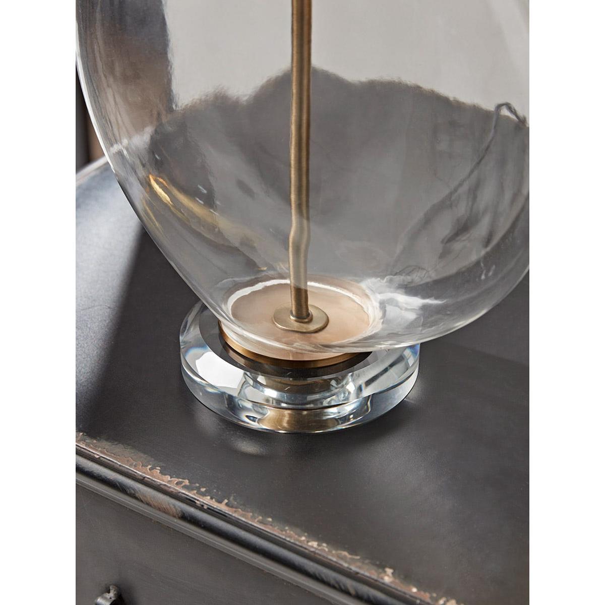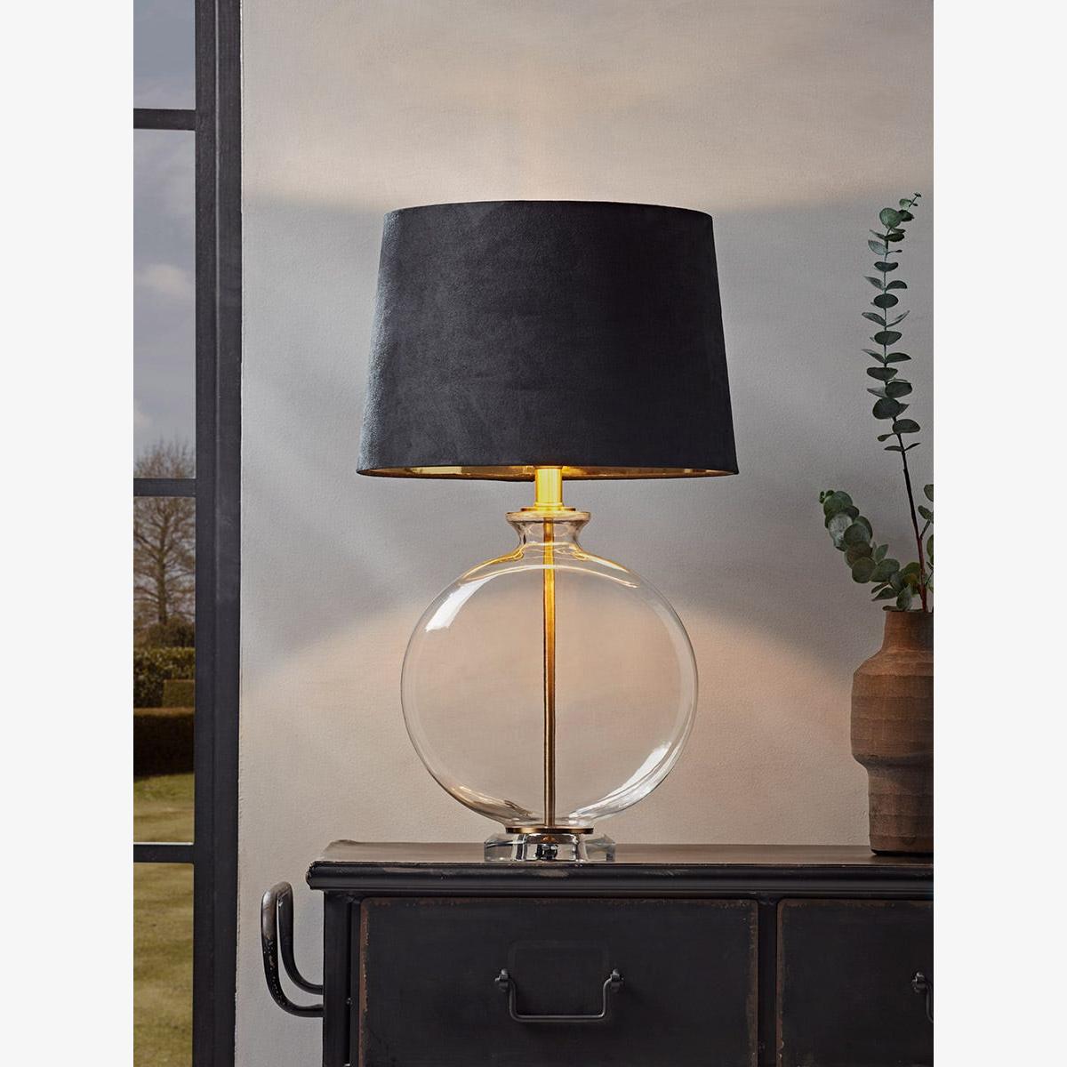 A striking combination of brass, clear glass and navy make this lamp a sophisticated addition to your home. The globe shaped glass base finishes in a bottle neck and is topped with a rich navy suede-look shade lined with gold for a warming glow. The perfect partner for a smart console table. Discover how to create the perfect lighting scheme for your home using our. Lighting Buying Guide.