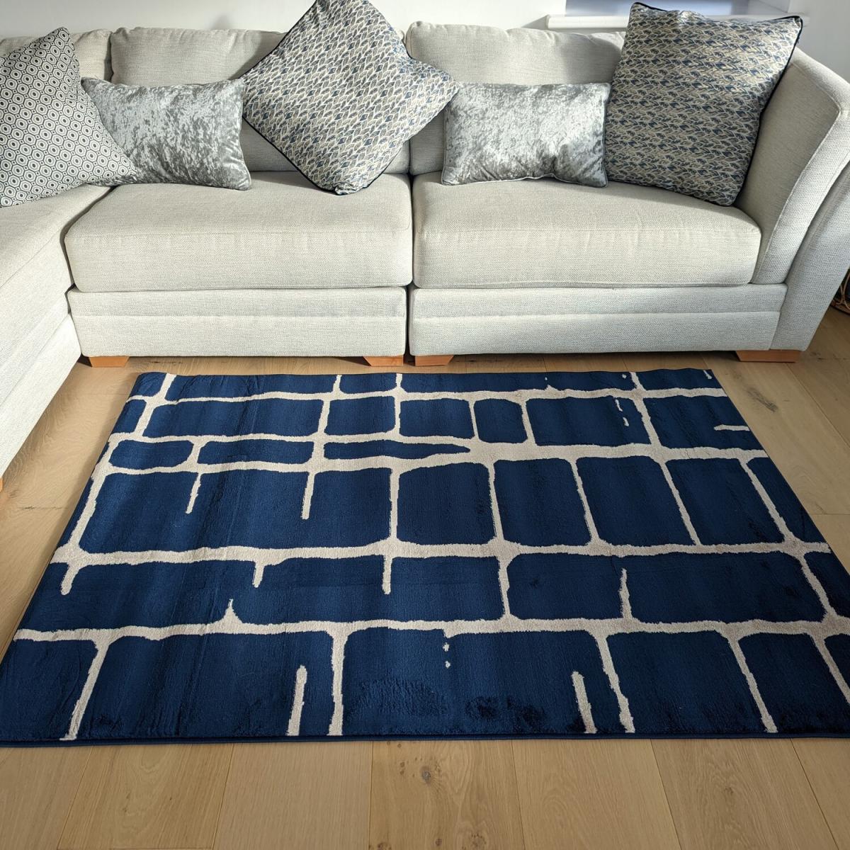 The navy blue and ivory fractured design rug is a versatile piece that can elevate a variety of living room interiors. I love its modern geometric pattern, which adds visual interest without overpowering the space. It works particularly well in contemporary or minimalist settings, balancing the warmth of traditional furniture like a leather Chesterfield with its clean lines and colour palette. Practical styling tips include pairing it with neutral sofas and colourful or textured cushions to create a layered look. Additionally, it’s a great choice for adding depth to a monochrome or cool-toned room, making the overall design feel cohesive and polished.