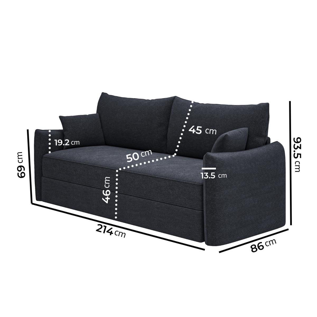 Stylish and compact, this 3-seater sofa bed is the perfect modern solution for smaller living spaces or multifunctional rooms. Upholstered in a cosy, textured chenille fabric, it offers both comfort and long-lasting quality—perfect for everyday lounging. Transforms easily into a spacious bed for two with a smooth pull-out mechanism and comfy fold-out mattress, ideal for overnight guests. Perfect when space is limited, this compact sleeper includes matching scatter cushions and removable cushion covers for easy cleaning. Supplied flat-pack for easy delivery and movement into your preferred room—functional, comfortable, and stylish from the moment it arrives. Designed with both comfort and practicality in mind, the River sofa bed is the perfect addition to modern, compact homes. Upholstered in a soft yet durable navy blue chenille fabric, it brings a calming and cosy feel to any living space, while seamlessly blending with a variety of interior styles.