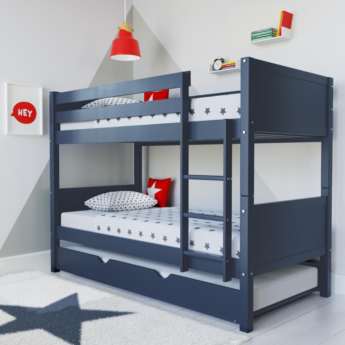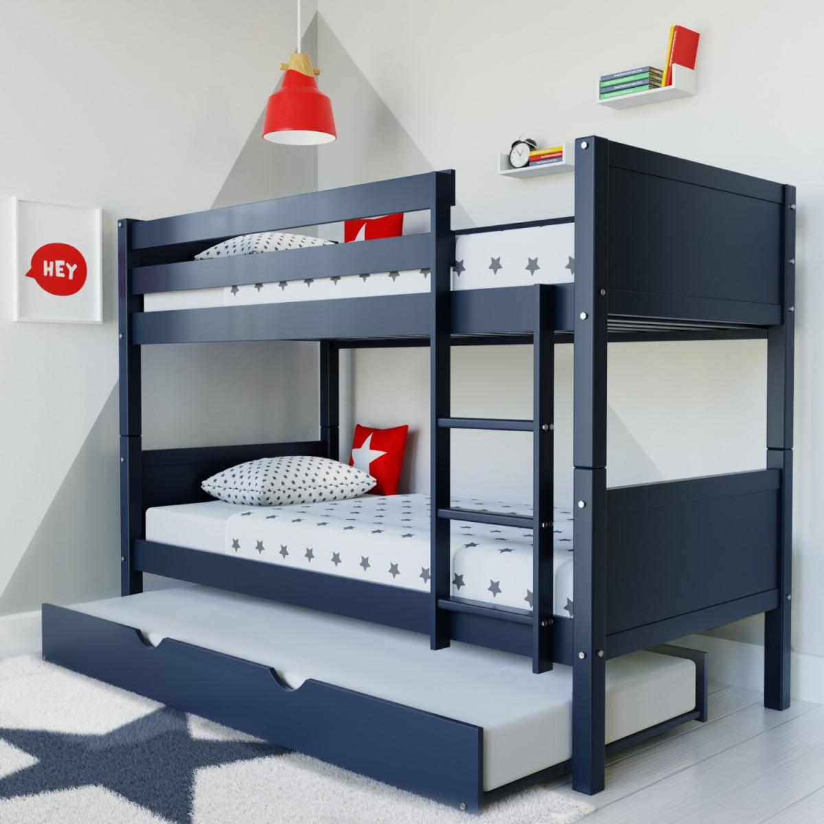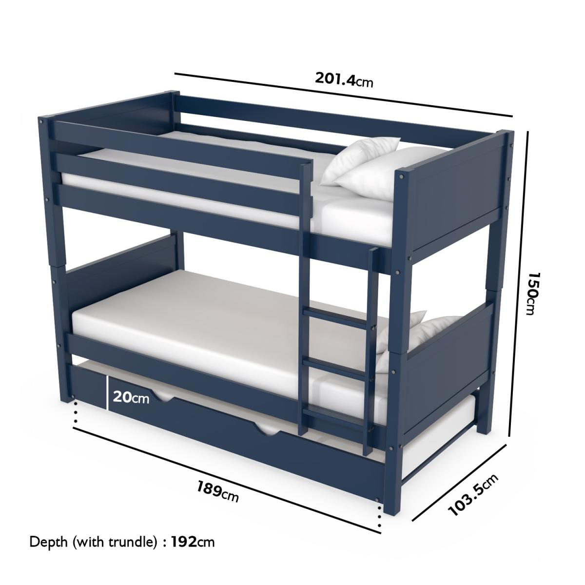 Navy blue wooden bunk bed with pull-out trundle bed Built from solid pine with a durable painted finish Ladder can be attached to left or right side of bed Detachable bunk beds can be separated into 2 beds Trundle has integrated castors for a smooth transition Search 'Luca' to see other colours in the range Need to know Mattress size: Standard UK single (3ft) Max supported weight (per bunk): 80kg Max mattress depth: 20cm Weight: 81.1kg Colour: Navy blue Finish: Painted Material: Solid pine wood and MDF Bed slats: Solid pine wood Mattress included: No Assembly required: Yes - minimal