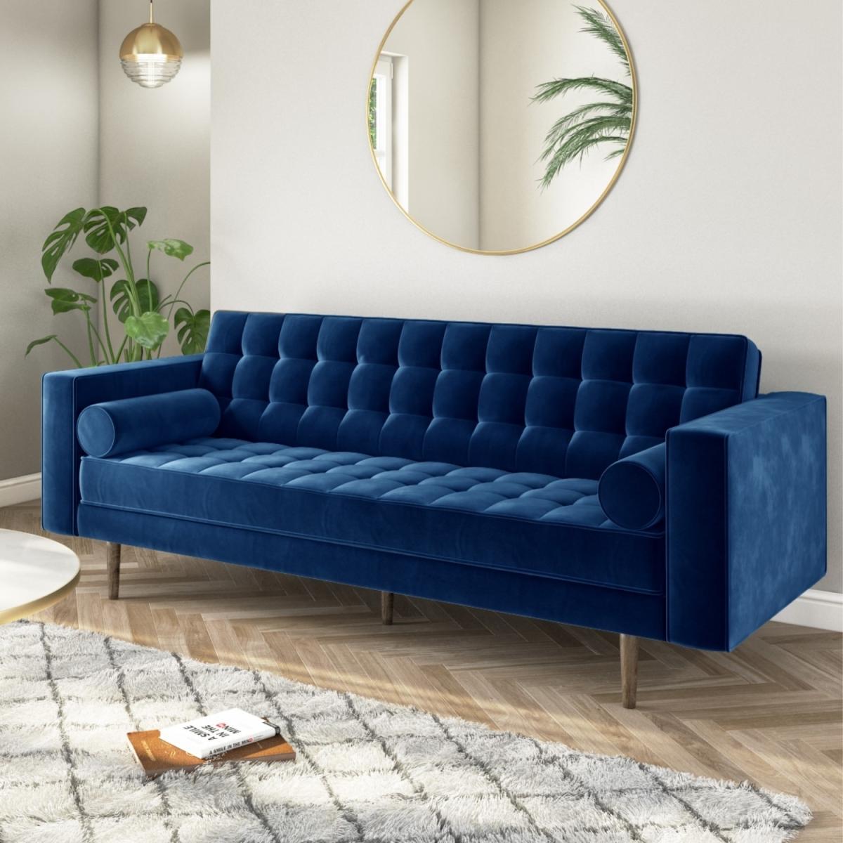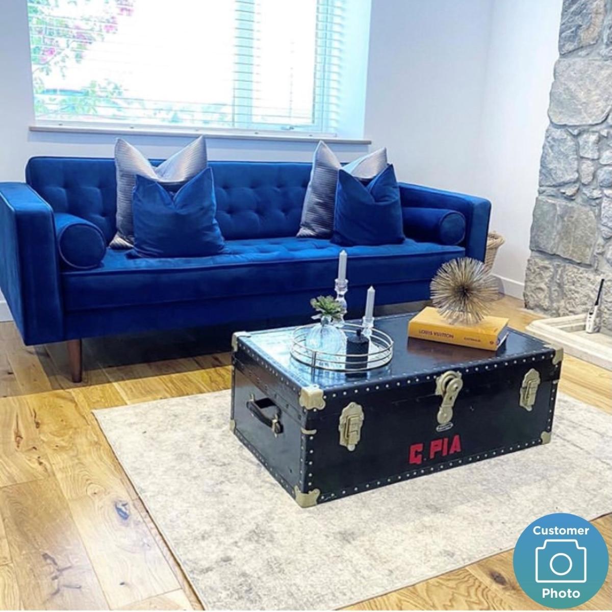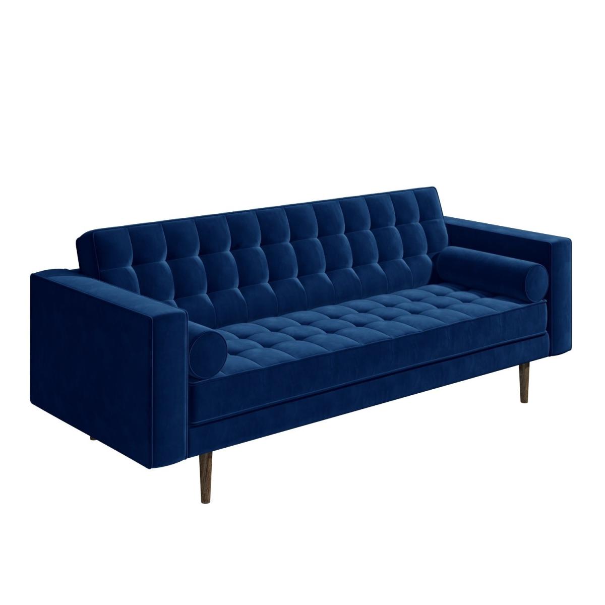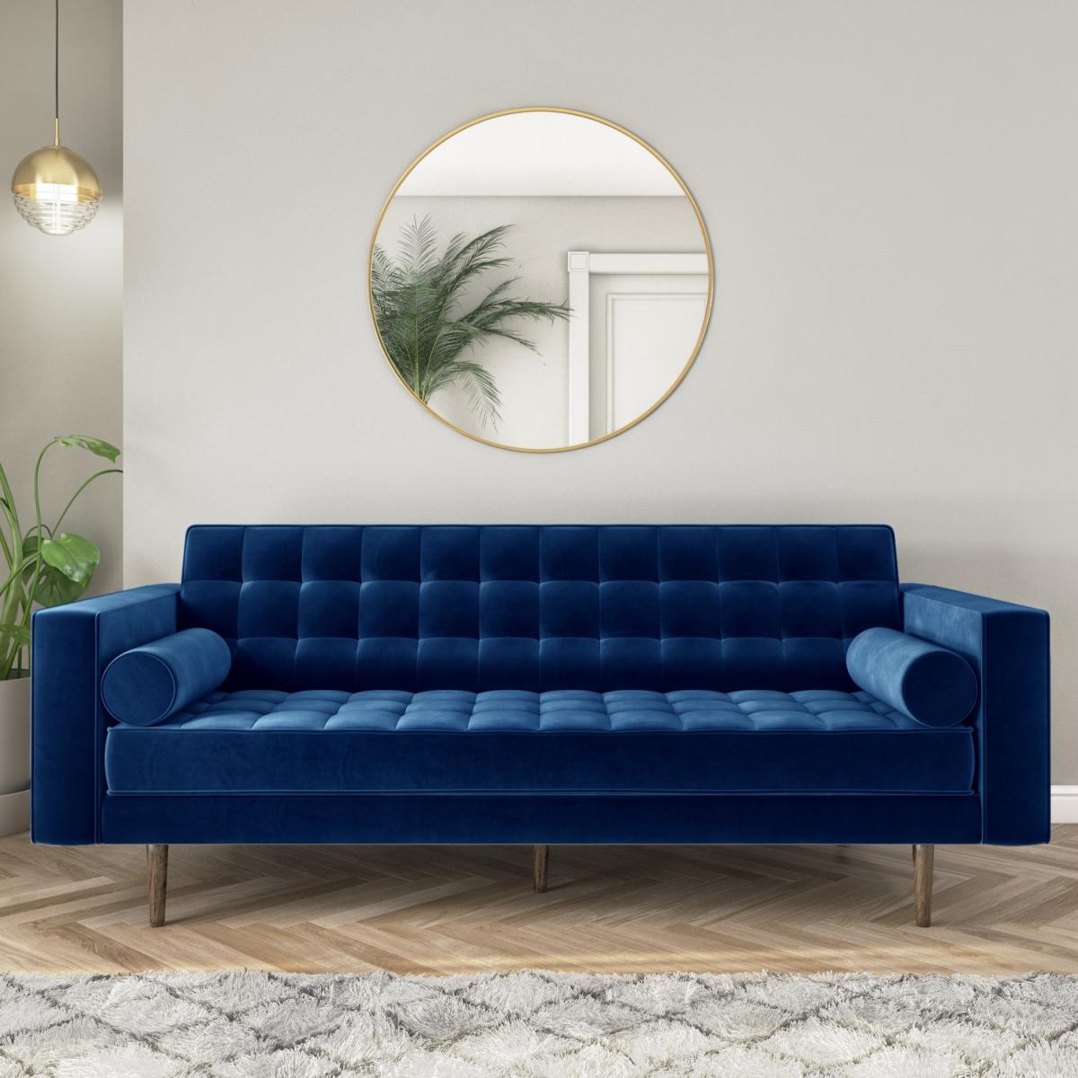 Features we love Mid-century inspired design with a fresh and modern twist Discover supreme comfort with this gorgeous foam-filled sofa. Double piping and deep button detailing incorporate a touch of traditional styling. Sophisticated blue velvet finish. Tapered dark brown birch legs contrast beautifully keeping the design fresh. Included bolster cushions add comfort and elegance All about me. The Elba 3 seater sofa is a beautiful combination of classic and contemporary styling. Discover maximum comfort and minimum maintenance with this gorgeous foam-filled sofa. The clean square lines are inspired by the mid-century whilst the double piping and buttoned back add just the right amount of opulence. The clean arms and tall tapered legs in a contrasting dark birch wood keeps the design fresh. It's finished beautifully in a sophisticated blue velvet. The sofa has been carefully crafted with a combination of tough materials so you can rest easy. The frame has been made using solid eucalyptus wood and thick plywood. Whilst the interior consists of S springs and quality foam to create a durable and comfortable platform. The design sits upon solid birch legs in rich dark brown which contrasts the rich dark green finish beautifully whilst giving the sofa a floating effect that is ideal for enhancing the look of space in smaller rooms. The sofa is complete with two bolster cushions adding that finishing touch of luxury and comfort. The sofa will require minor assembly it shouldn't take longer than 20 minutes as it's simply a case of fixing the tapered legs into position. Need to know. Dimensions. H78 x W209 x D85 cm Packed Dimensions. No. of Boxes 1 - Weight 48kg - H49 x W210 x D87 cm Material. Solid birch solid eucalyptus wood and; thick plywood Finish. Blue velvet Filling. Foam Assembly required. Yes – less than 20 minutes More info Double piping detail. Invisible zipper cushions. Seats and back cushion have removable and washable covers. High density full foam seat base provides excellent comfort and durability. Solid birch wooden legs. Durable S spring base Quick and easy assembly.