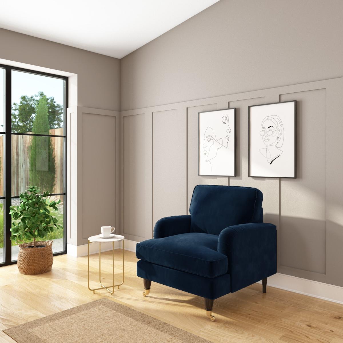 I love this navy blue velvet armchair for its rich colour and luxurious texture, which adds depth and elegance to any space. It works particularly well in classic or contemporary interiors, creating a statement piece that oozes sophistication. For styling, consider pairing it with soft textiles like a cosy throw or patterned cushions to soften the look, or integrate it into a tonal scheme with other navy or grey accents. Practical tips include placing it near a window for natural light to enhance the velvet's depth, and pairing it with a small side table for functionality. It’s versatile enough for living rooms, reading nooks, or even a bedroom corner, making it a timeless addition to various interiors.