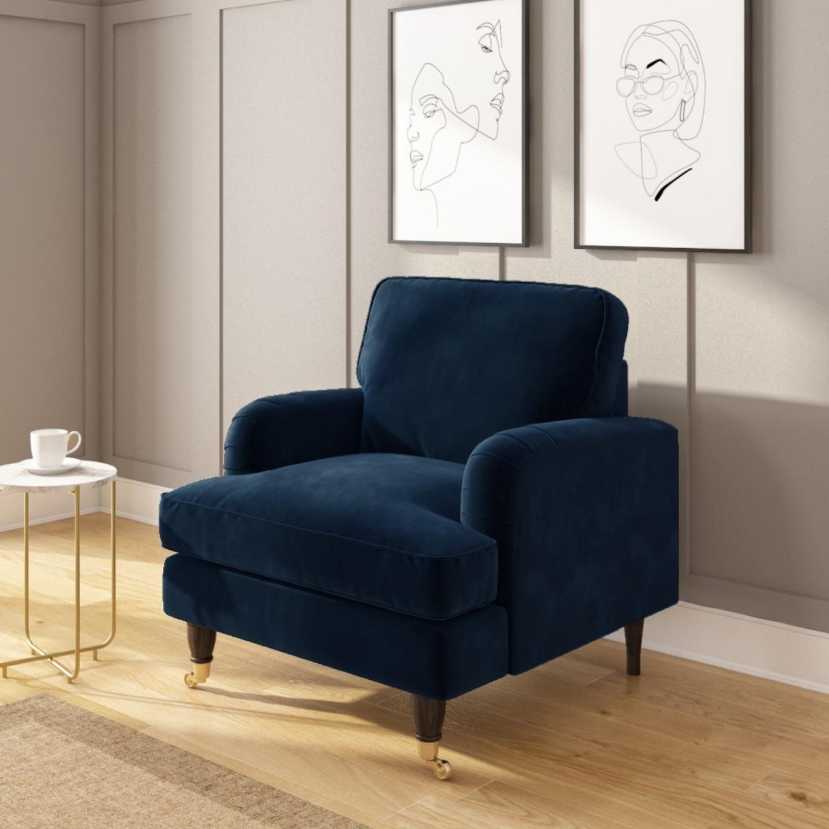 Discover maximum comfort and minimum maintenance with this gorgeous armchair. This plush Payton Armchair offers traditional styling with a modern twist thanks to its dark wooden legs with gold accent front castors and classic ruched saddle arms. Beautifully tailored and upholstered in dark navy blue velvet, making it the perfect statement piece. Adding this trend-setting piece to your home is easy. There's minimum assembly; it's just a case of fixing the legs into position.