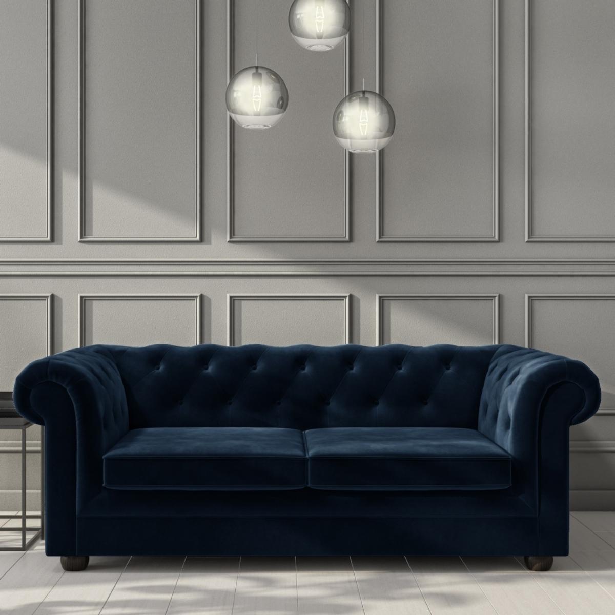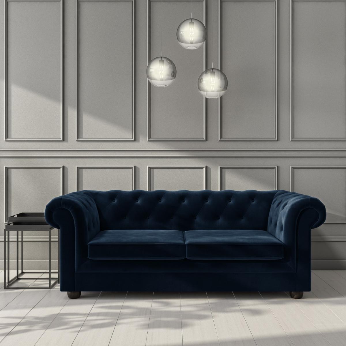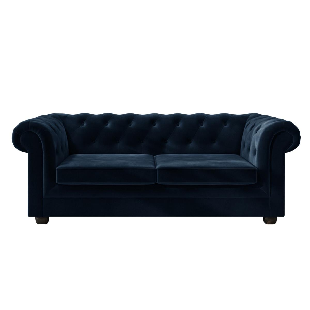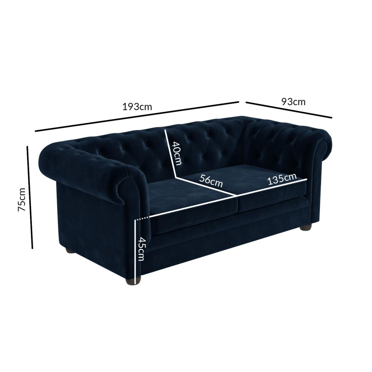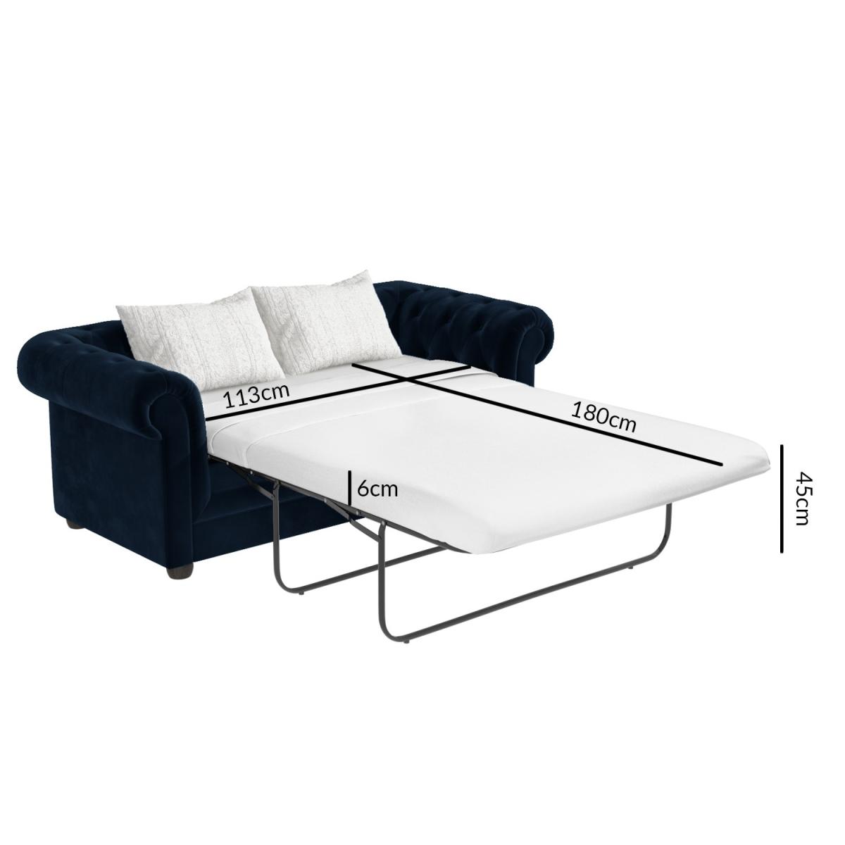 Chesterfield inspired sofa bed has a traditional feel Upholstered in luxuriously soft, navy blue velvet Stud buttoning and scrolled arms create a classic look Quick assembly – ideal for last-minute guests Mattress included: W113cm x D180cm (6cm thick) Polished wooden feet round the look off perfectly Equally as perfect for spare bedrooms and multiuse rooms Need to know Seat height: 45 cm Packed weight: 74 kg Colour: Navy Blue Finish: Velvet upholstery Material: Velvet fabric, Wooden sofa frame, Metal bed frame Assembly required: Yes (Attach feet to the bottom)