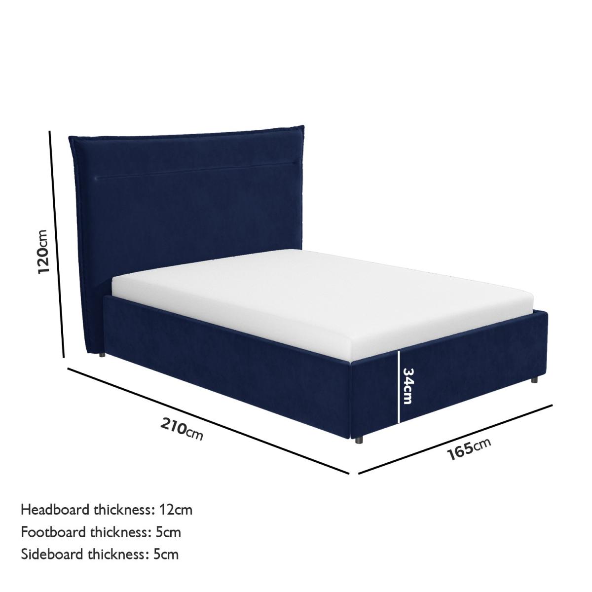 Features we love Upholstered in high-quality velvet for a luxury finish. Contemporary headboard creates an instant focal point. Navy-blue finish will complement a wide range of décor Sprung slatted base offers durability and comfort. The Maddox bed is also available in king size. Need to know. Dimensions. W165 x D210 x H120cm Mattress size. Standard UK double (4ft6) Colour. Navy-blue Finish. Velvet headboard Material. Solid plywood frame and velvet fabric Base. Sprung plywood with plastic end caps Mattress included. No Assembly required. Yes..