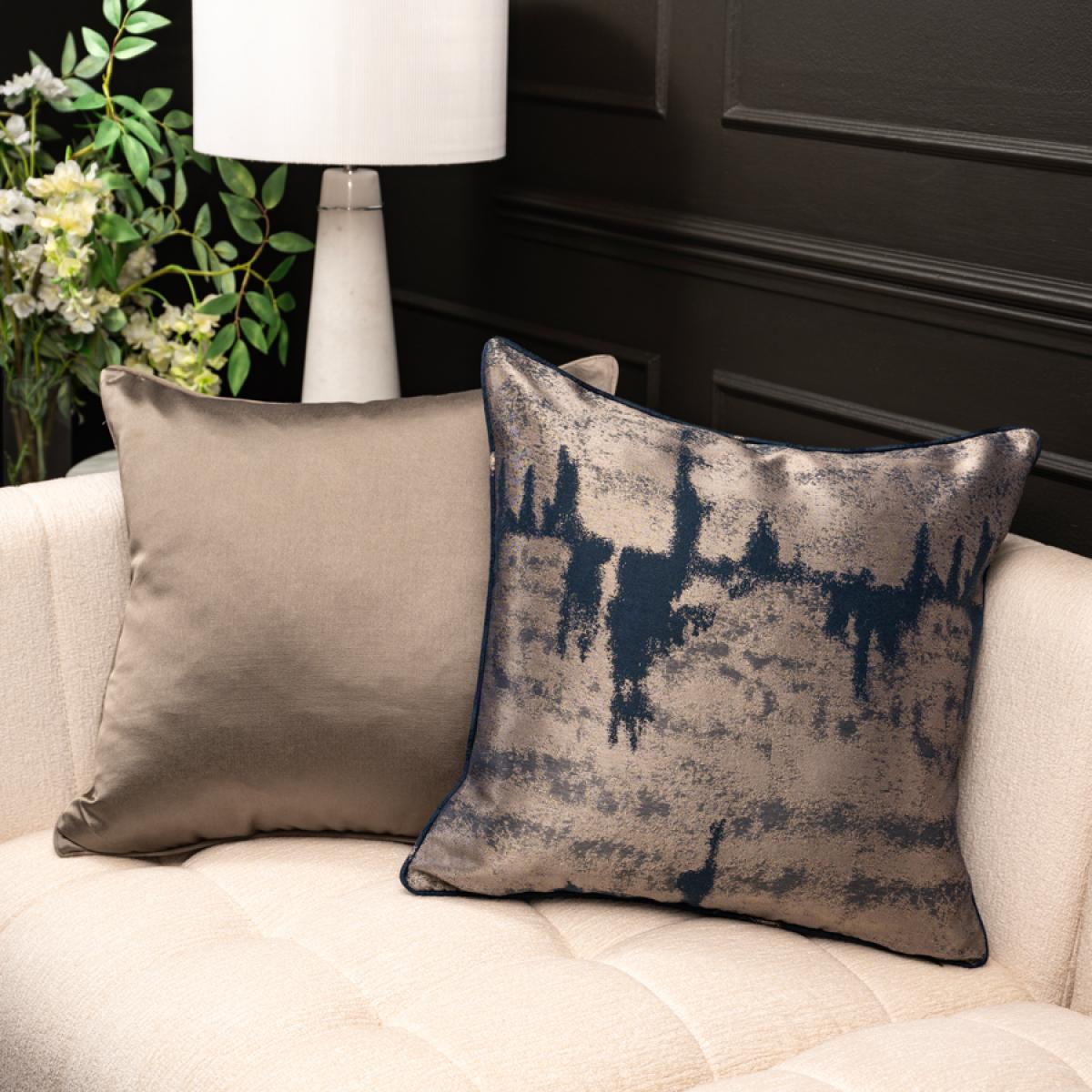 50cm x 50cm piped cushion with luxurious feather filling. High quality polyester fabric with woven abstract design. ‘Invisible’ zip fastening. Exclusive design. Dry clean only, do not bleach or tumble dry.