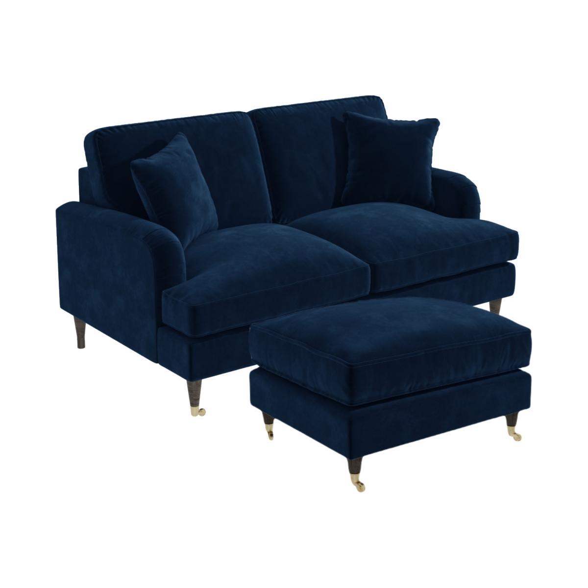 This bundle includes: 1 x Navy Velvet 2 Seater Sofa – Payton 1 x Navy Velvet Footstool – Payton Features we love Navy velvet 2-seater sofa and footstool set The sofa comes with two matching scatter cushions Removable cushion covers are easy to wipe clean The footstool can also be used as an additional seat Foam filled for super comfy living room seating All about me Create the ultimate cosy living room with this Payton navy velvet set, featuring a 2-seater sofa and footstool. It's the perfect combination of style and practicality, the navy upholstery with gold accent legs adds a pop of colour while being the ideal place to relax with your feet up after a long day. Need to know Sofa Overall dimensions:H85 x W150 x D96 cm Seating dimensions: W124 x D60 cm Packed dimensions:H61 x W152 x D98 cm Packed weight: 50 kg Colour: Navy Finish: Velvet upholstery and wooden legs Material: Velvet (100% polyester), wooden frame and legs and metal castors Filling: Foam Assembly required: Yes - just attach the legs Footstool Overall dimensions: W75 x D62 x H44 cm Packed dimensions:W77 x D64 x H31 cm Packed weight: 10 kg Colour: Navy Finish: Velvet upholstery and wooden legs Material: Velvet (100% polyester), wooden frame and legs and metal castors Assembly required: Yes - just attach the legs