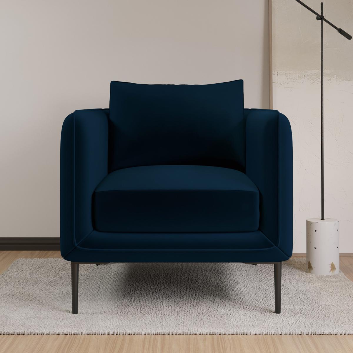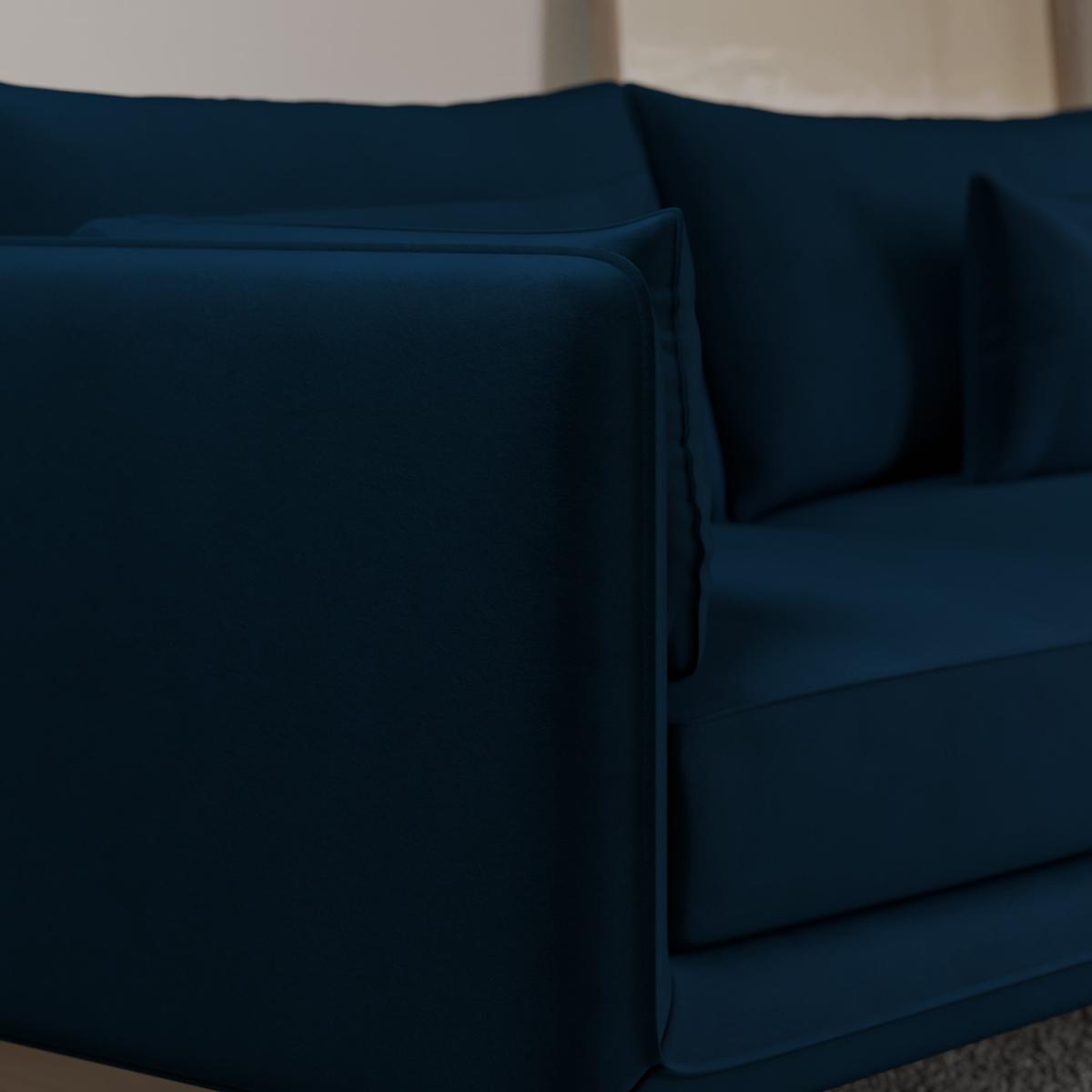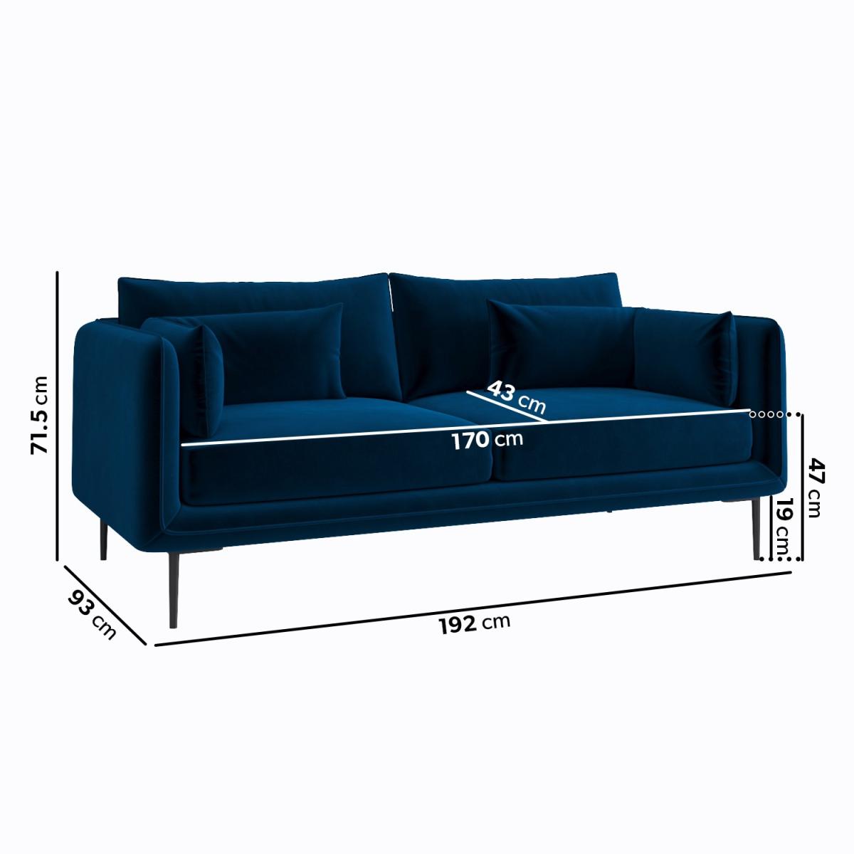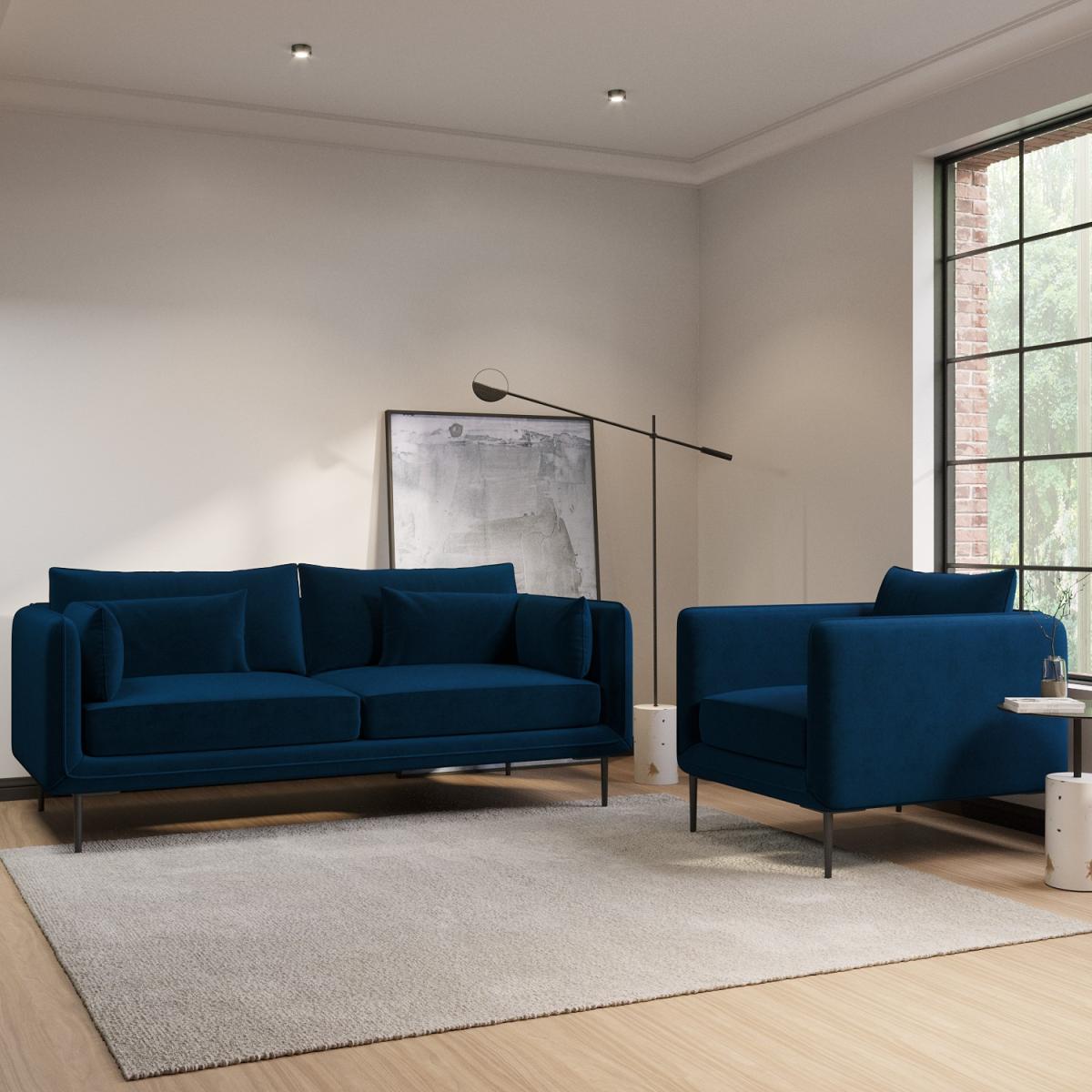 Removable Back Covers Foam filled Reversible Back Cushions Scatter Cushions Included This sofa set includes: 1 x Navy Velvet 3 Seater Sofa 1 x Navy Velvet Armchair Need to know 3 Seater Sofa Information Dimensions:W192 x D93 x H71.5 cm Packaging dimensions:W194 x D95 x H56 cm Weight: 42 kg Max supported weight: 110 kg Seats: 3 Colour: Navy, black legs Finish: Velvet upholstery Material: Eucalyptus & plywood frame, metal legs Filling: Foam Assembly required: Yes - just attach the legs Armchair Information Dimensions:W62 x D56 x H47 cm Packaging dimensions: W64 x D58 x H31 cm Weight: 9 kg Max supported weight: 110 kg Colour: Navy, black legs Finish: Velvet upholstery Material: Eucalyptus & plywood frame, metal legs Filling: Foam Assembly required: Yes - just attach the legs