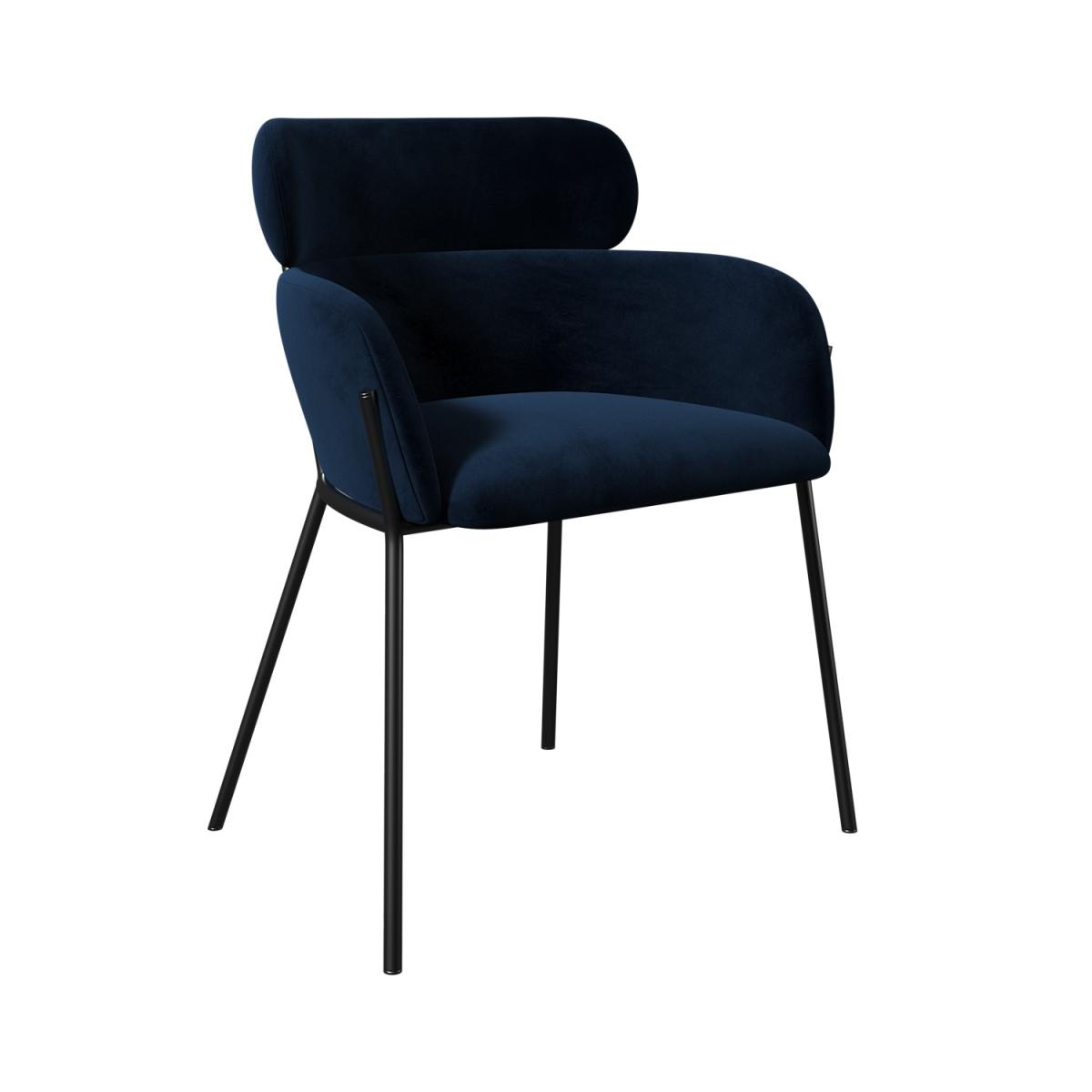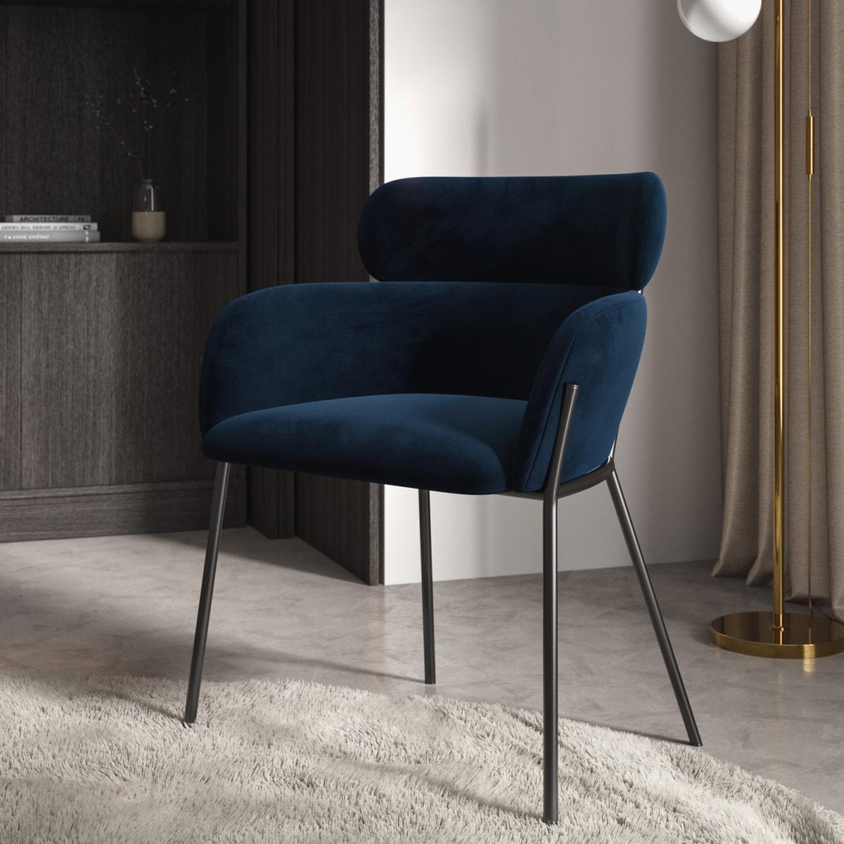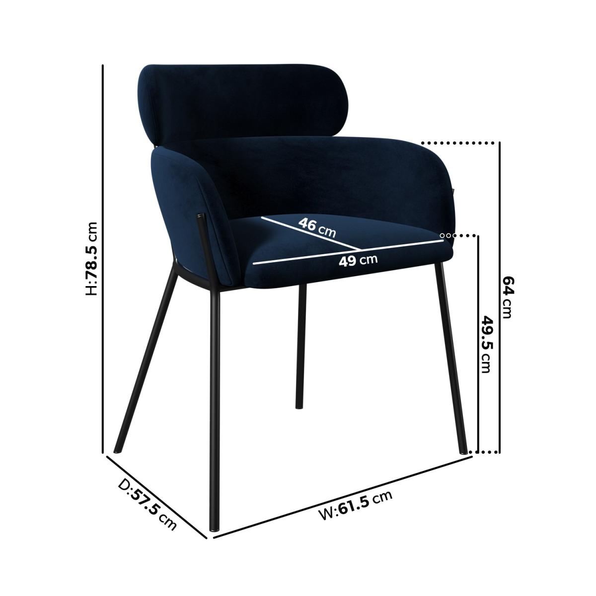 All about me The modern Isla armchair boasts a unique back and arm design that's guaranteed to create a dark and sophisticated statement in any living room, and it's filled with spongey foam to make the perfect comfy seat. The opulent velvet fabric is made from recycled plastic bottles, so it not only looks stunning in your home, but it's also great for the environment. Need to know Dimensions:W61.5 x D57.5 x H78.5 cm Weight: 7.9 kg Max supported weight: 130 kg Colour: Navy and black Finish: Upholstered and powder coated legs Material: Velvet fabric (made from recycled plastic bottles) and metal legs Assembly required: Yes – just attach the legs Packed dimensions:W83 x D63 x H52 cm