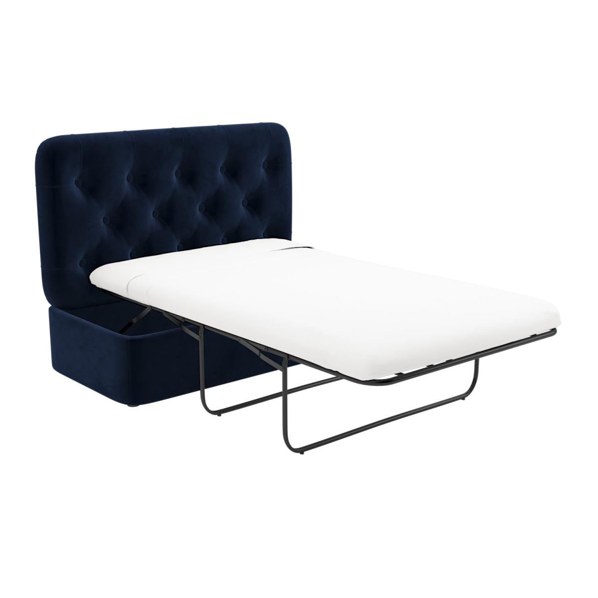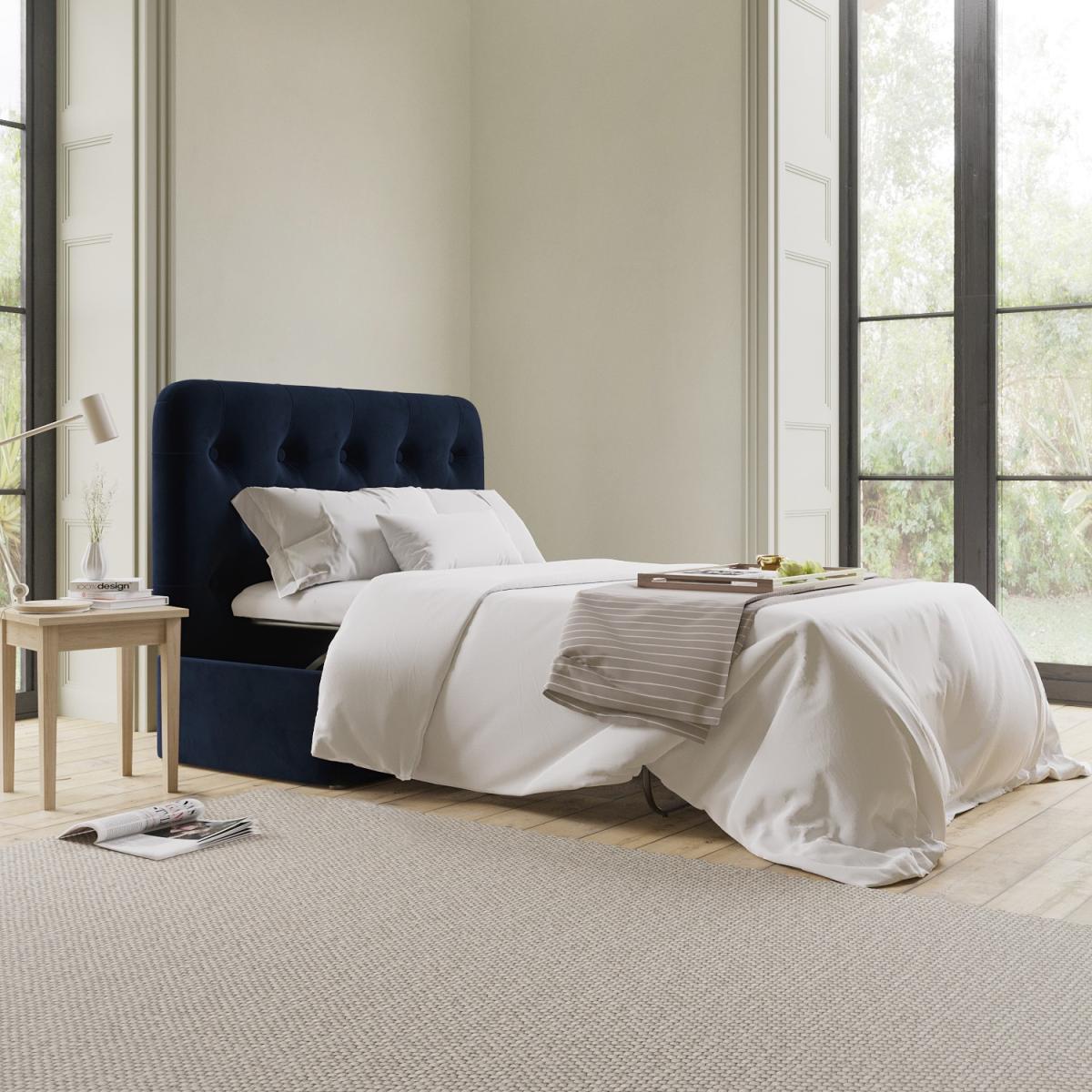 All about me This modern, large footstool makes the perfect addition to any space in your home. You would never guess there was a pull-out bed. It's quick and easy to fold out via the pull-out mechanism and even comes with an integrated mattress, so your guests are assured a restful night's sleep. The top even converts to a sturdy headboard, thanks to the secure attaching. As a footstool it's also practical as it can be used as extra seating or to rest your legs and relax. Plus, its solid wood frame construction ensures its longevity. Need to know Dimensions as footstool:W210 x D82 x H84 cm Dimensions in bed position: W139 x D216 x H120 cm Seat height in bed position: 46cm Mattress dimensions:W113 x D181 x H6 cm Product weight: 42kg Max weight capacity: 170kg Colour:Olive green Finish: Upholstered Material: Wood frame, metal, foam and velvet fabric Filling: Foam-filled Mechanism: Pull-out Assembly required: Yes Mattress included: Yes Packaging dimensions: W141 x D78 x H44 Packaging weights: 50kg
