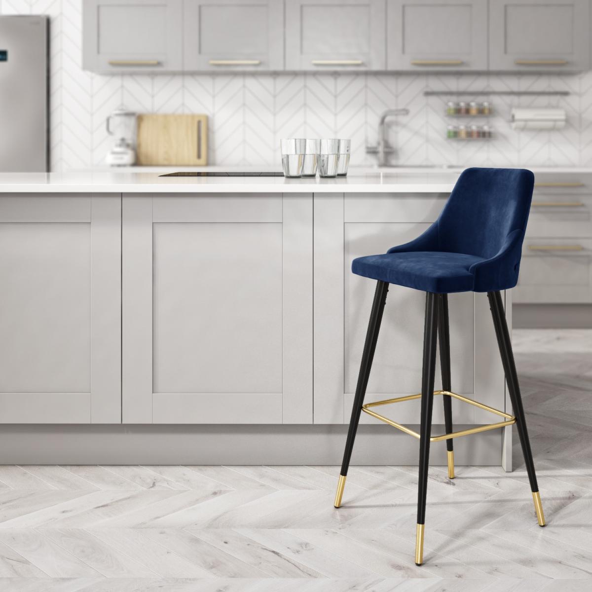 Upholstered in lush blue velvet, perfect addition to your home and ideal for a breakfast bar or seating around the kitchen island. Finished with black powder-coated tapered legs and a complementing gold footrest.