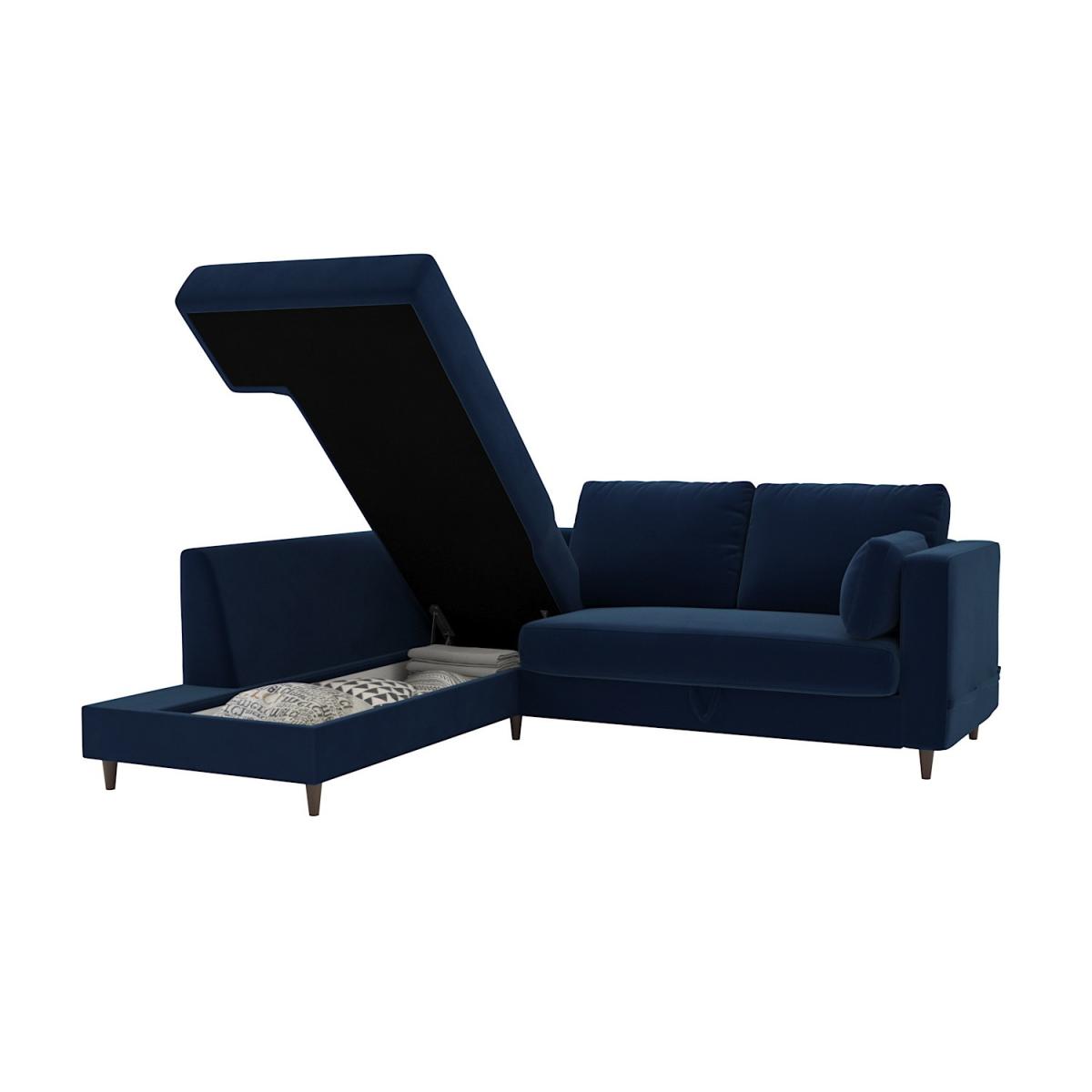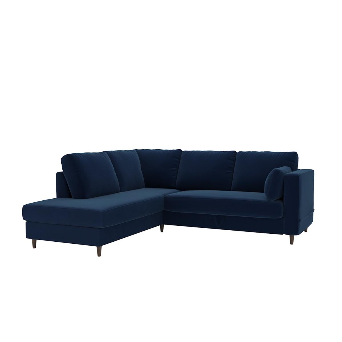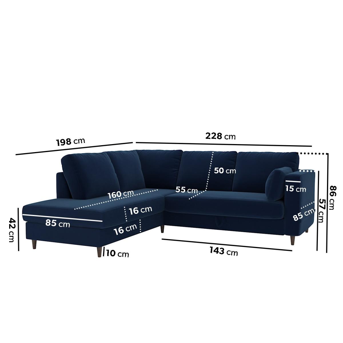 Foam filled Scatter Cushions Included Features we love Navy velvet left hand corner sofa bed with ottoman storage Easily turn into a sofa bed for 2 with pull out mechanism Reversible back cushions provide great back support Frame constructed from sustainably sourced hardwood, it is built to last Seat and back cushions are filled with foam for maximum comfort All about me Create the ultimate relaxation space in your living room with the Boe navy left hand facing corner sofa. Stylish yet practical, it quickly converts into a bed for 2, plus it has an ottoman storage section which is perfect for keeping blankets and bedding handy. Easily access the ottoman storage with the gas lift mechanism. This sofa is very practical, with handy side pockets you will never lose your tv remote again! Minimal assembly is required, just simply slot both pieces together and screw legs in. It'll be ready in no time! Need to know Dimensions:W228 x D198 x H86 cm Packaging dimensions (2 boxes):W148 x D88 x H55 cm, H200 x D88 x H55 cm Weight: 98 kg Seats: 4 people Bed size: Double Configuration: Left hand facing Maximum supported weight: 131kg per seat Alternating Chaise: No Colour: Navy Finish: Upholstered Material: Velvet fabric, hardwood frame and feet Filling: High-density foam (seats), 100% polyester (back) Assembly required: Yes - just slot both pieces together and fix legs into place