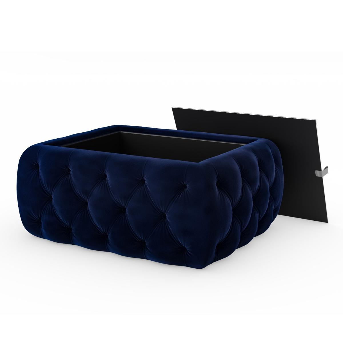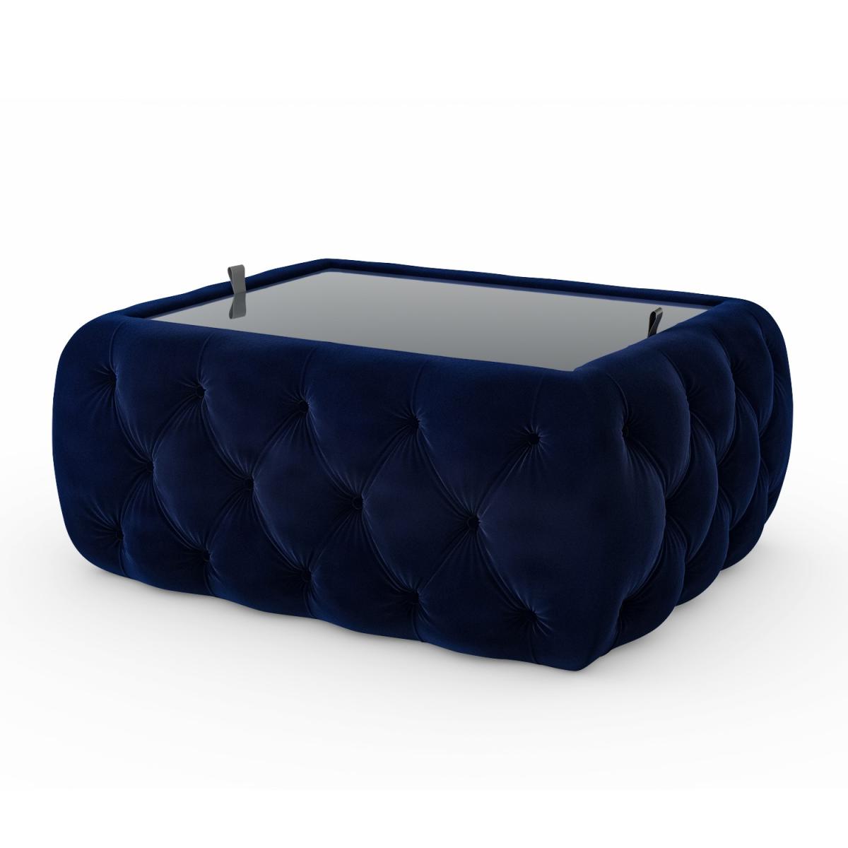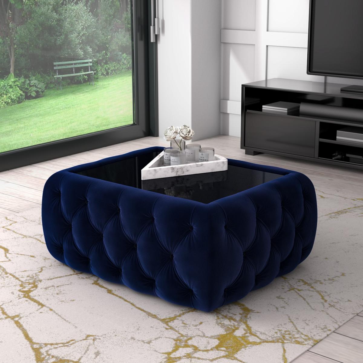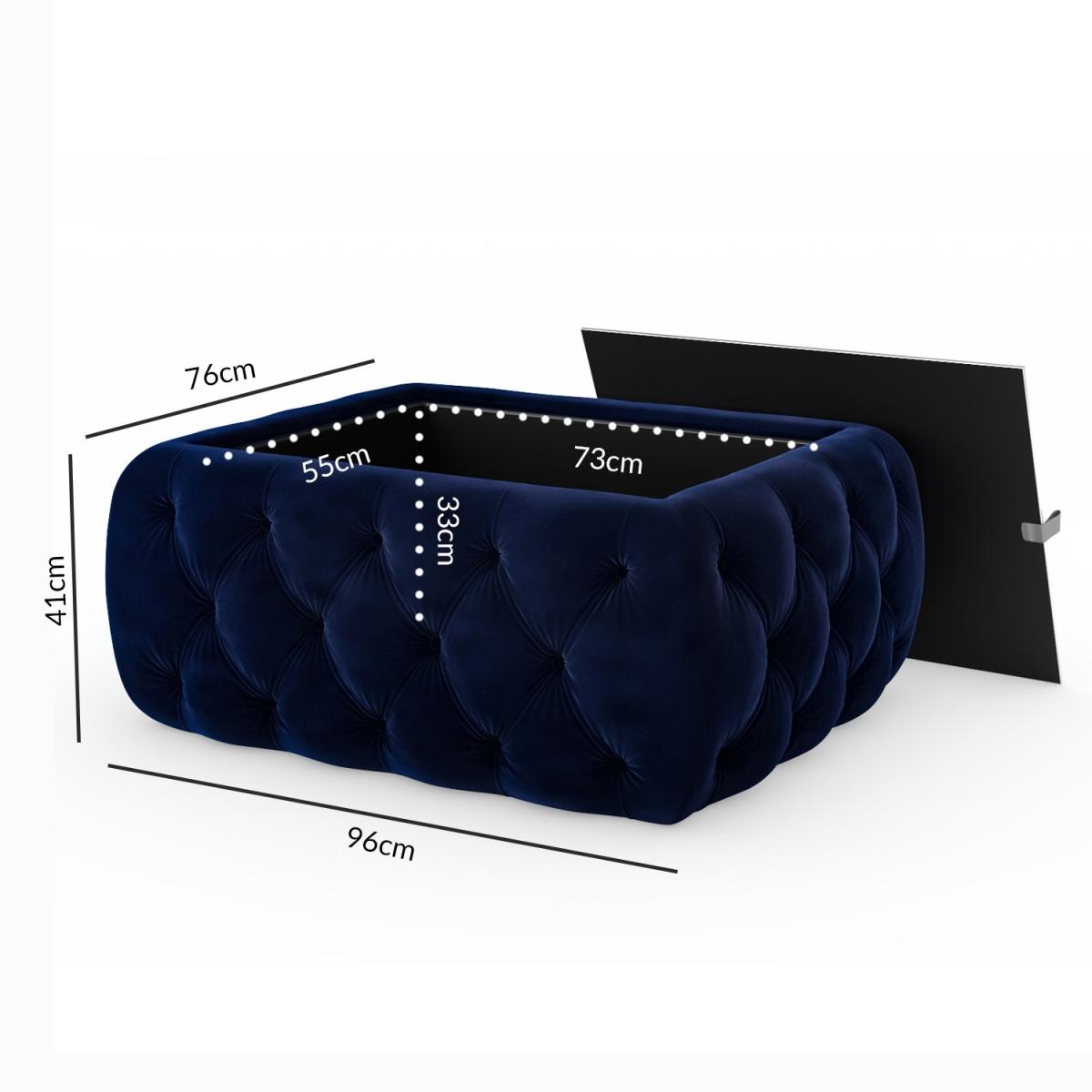 Features we love Beautifully upholstered in plush navy velvet Deep buttoned detailing adds a touch of luxury Black glass top lifts to reveal ample storage space Perfect for storing all your living essentials. Feature piece suitable for any room in your home. Also available in other shapes and colours. Need to know. Dimensions. H41 x W96 x D76 cm Interior dimensions. H33 x W73 x D55 cm Shape. Rectangle Colour. Navy blue Finish. Velvet upholstery and tempered glass top Material. Eucalyptus and plywood frame and velvet polyester fabric Assembly required. No..