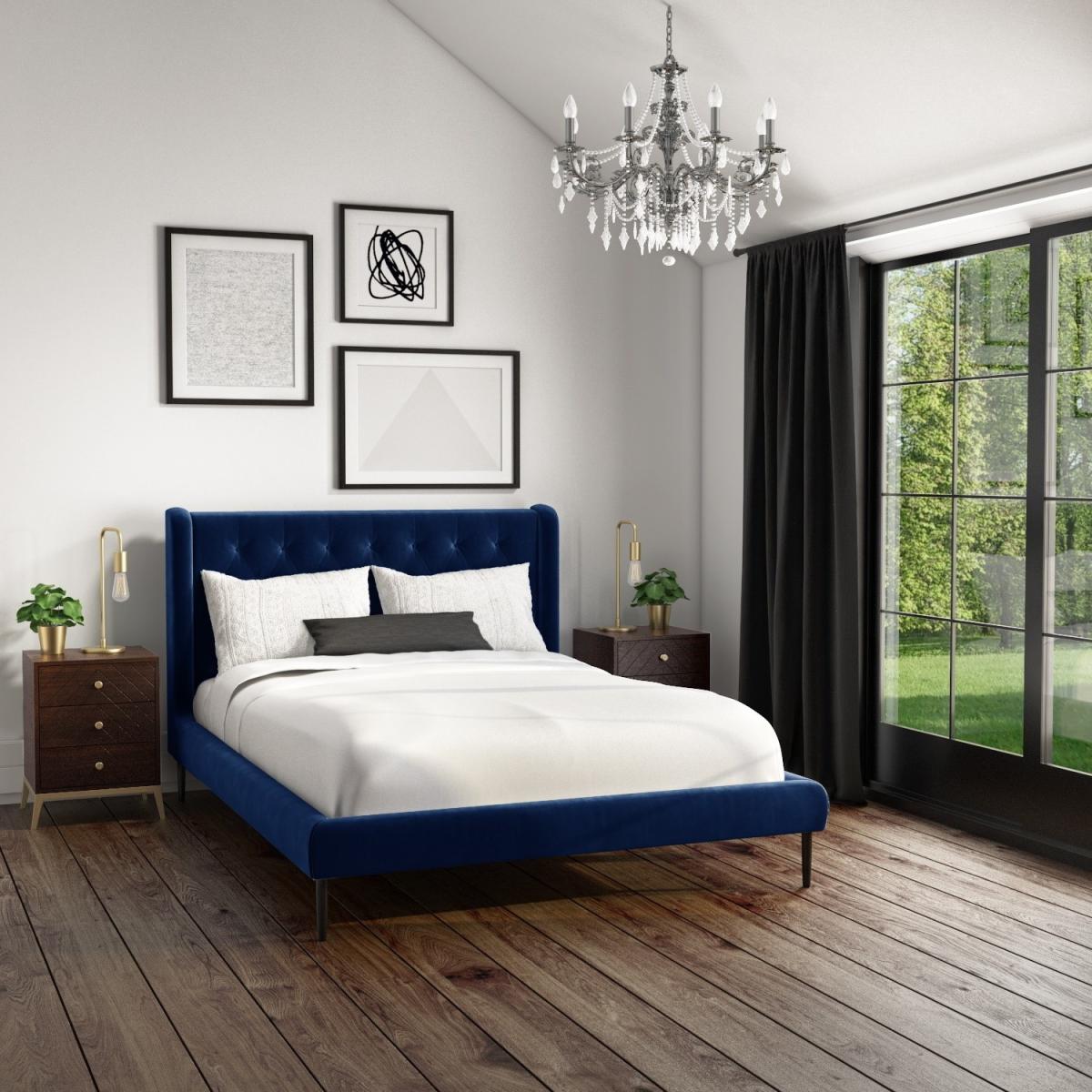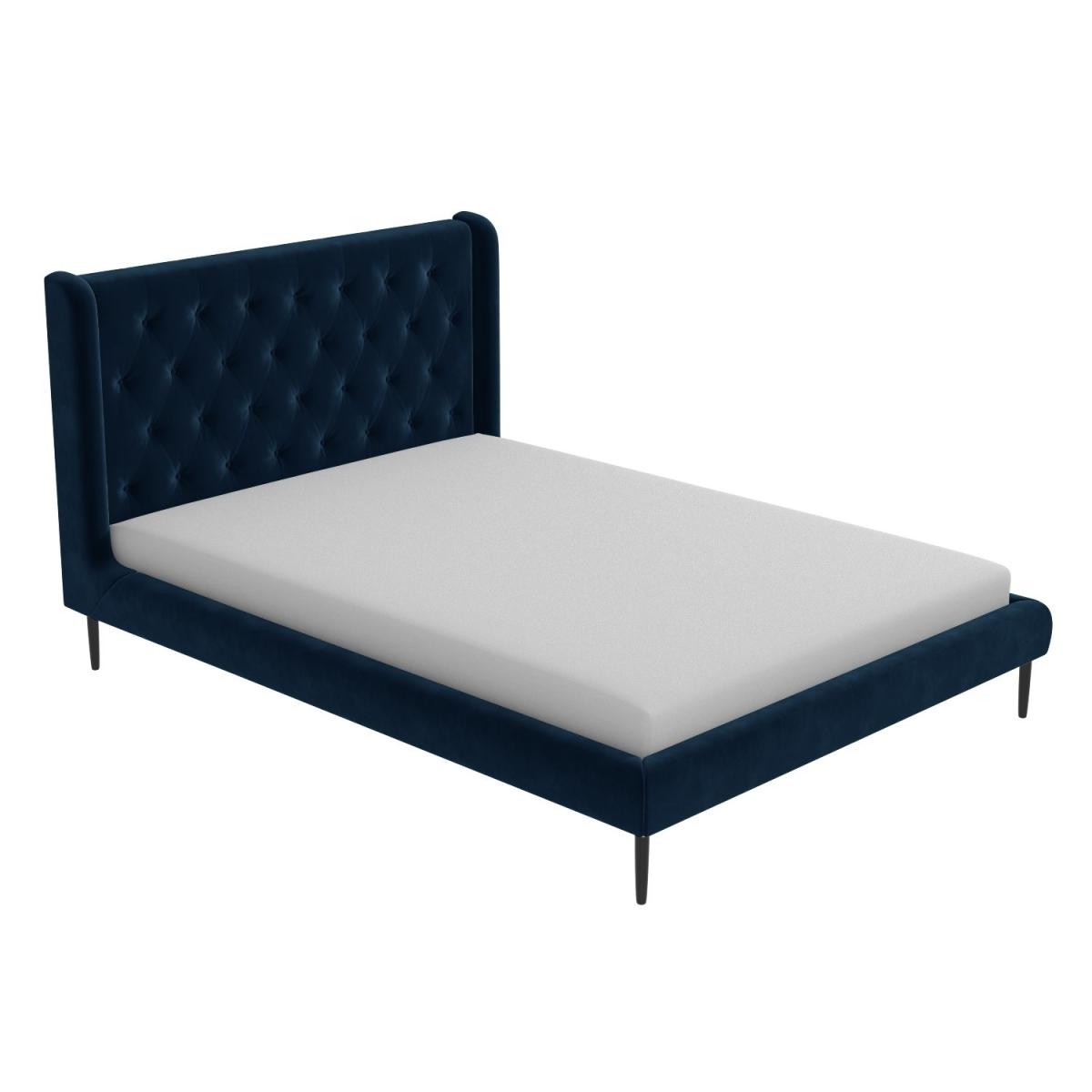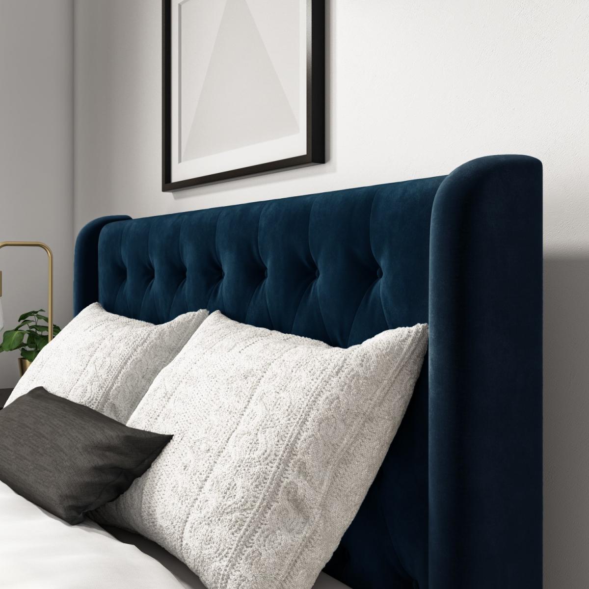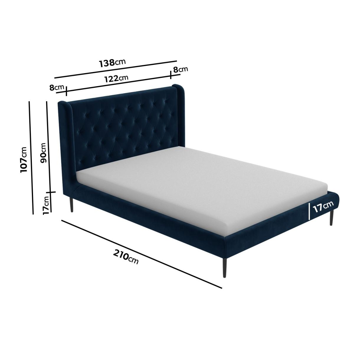 Features we love Elegant small double bed frame with winged headboard. Upholstered in ultra-soft navy blue velvet. Dark wooden legs complete the modern-luxe look. Button detail brings a chic touch to any bedroom. Wooden sprung-slatted bed base for ultimate comfort. Need to know. Dimensions. W138 x D210 x H107cm Mattress size. Standard UK small double (4ft) Weight. 35kg Colour. Navy-blue Finish. Upholstered Material. Velvet multi-layer board and poplar wood Mattress included. No Bed base. Wooden sprung-slatted Fixings included (if applicable). Start here Assembly required. Yes..
