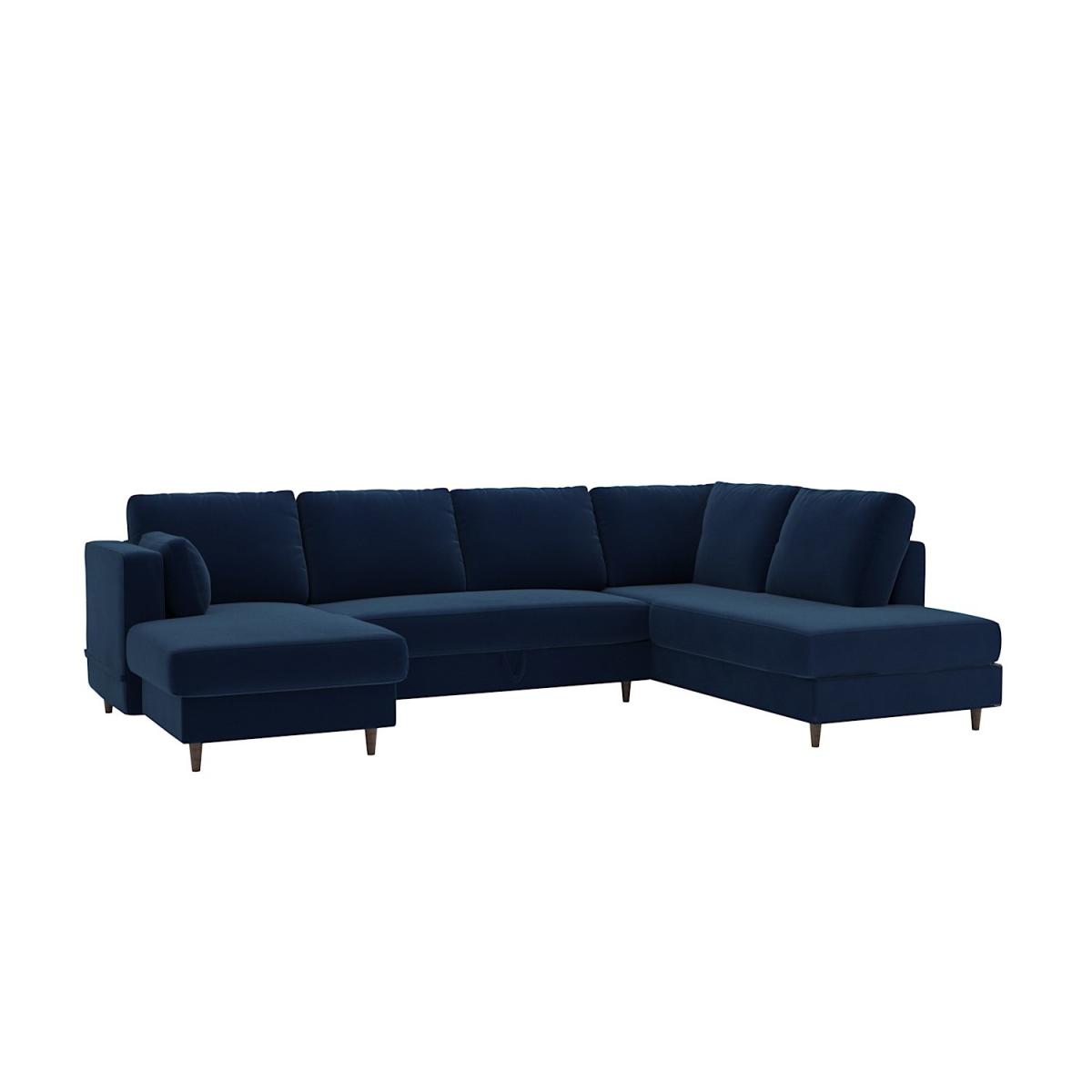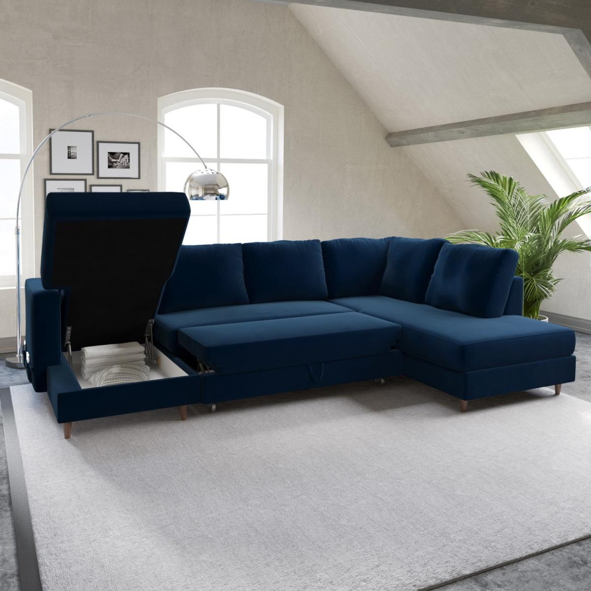 Foam filled Scatter Cushions Included All about me Create the ultimate relaxation space in your living room with the Boe navy u shape sofa. Stylish yet practical, it quickly converts into a bed, plus it has an ottoman storage section which is perfect for keeping blankets and bedding handy. This sofa is very practical, with handy side pockets you will never lose your tv remote again! Minimal assembly is required, just slot the 3 pieces together and screw the legs in. It'll be ready in no time! Need to know Dimensions:W296 x D198 x H86 cm Packaging dimensions (3 boxes):W200 x D88 x H55 cm, H136 x D88 x H57 cm, W144 x D83 x H57 cm Weight:142 kg Seats:6 people Bed size: Double Maximum supported weight:131kg per seat Colour:Navy Finish:Upholstered Material:Velvet fabric, hardwood frame and feet Filling:High-density foam (seats), 100% polyester (back) Alternating chaise: No Assembly required:Yes - just slot 3 pieces together and screw legs in