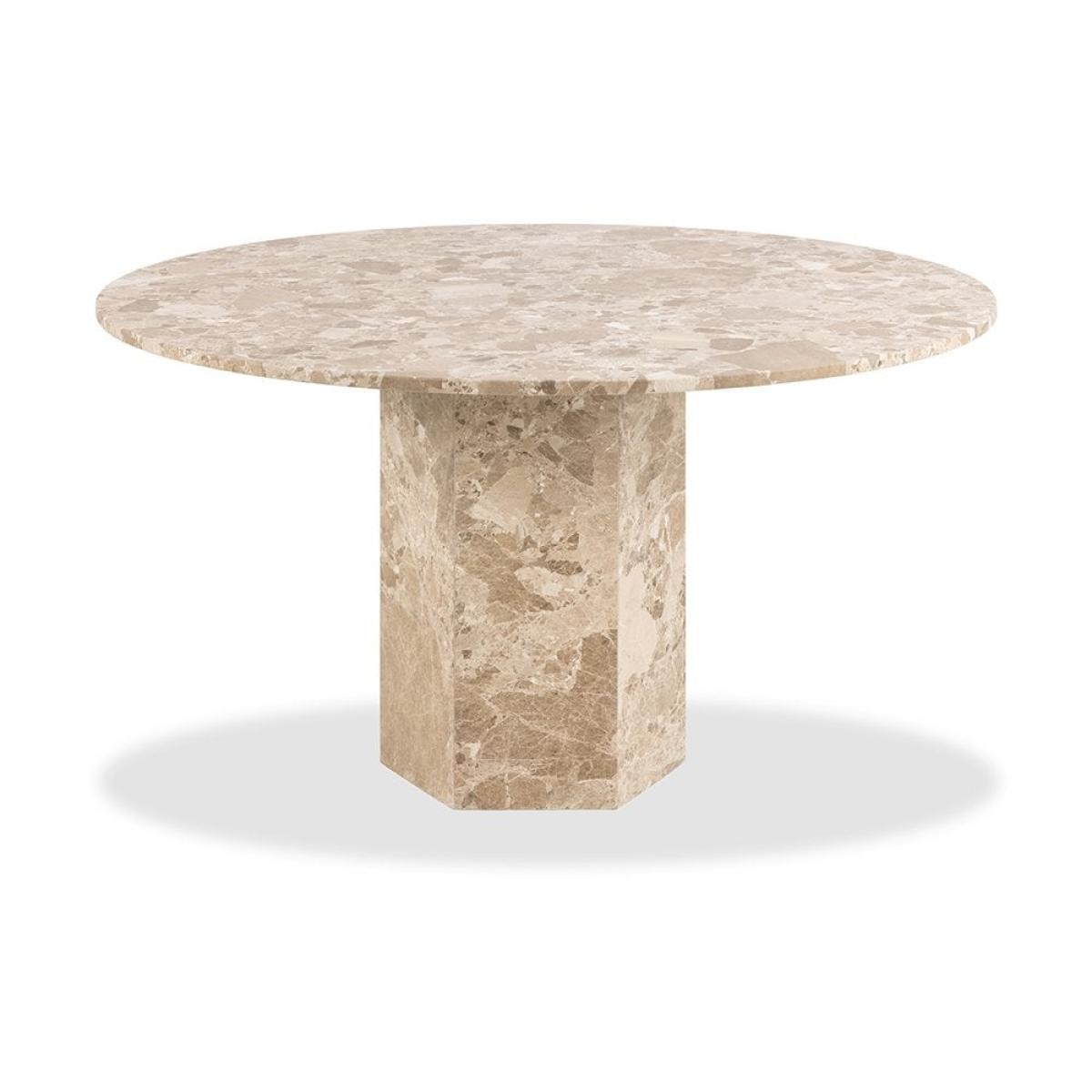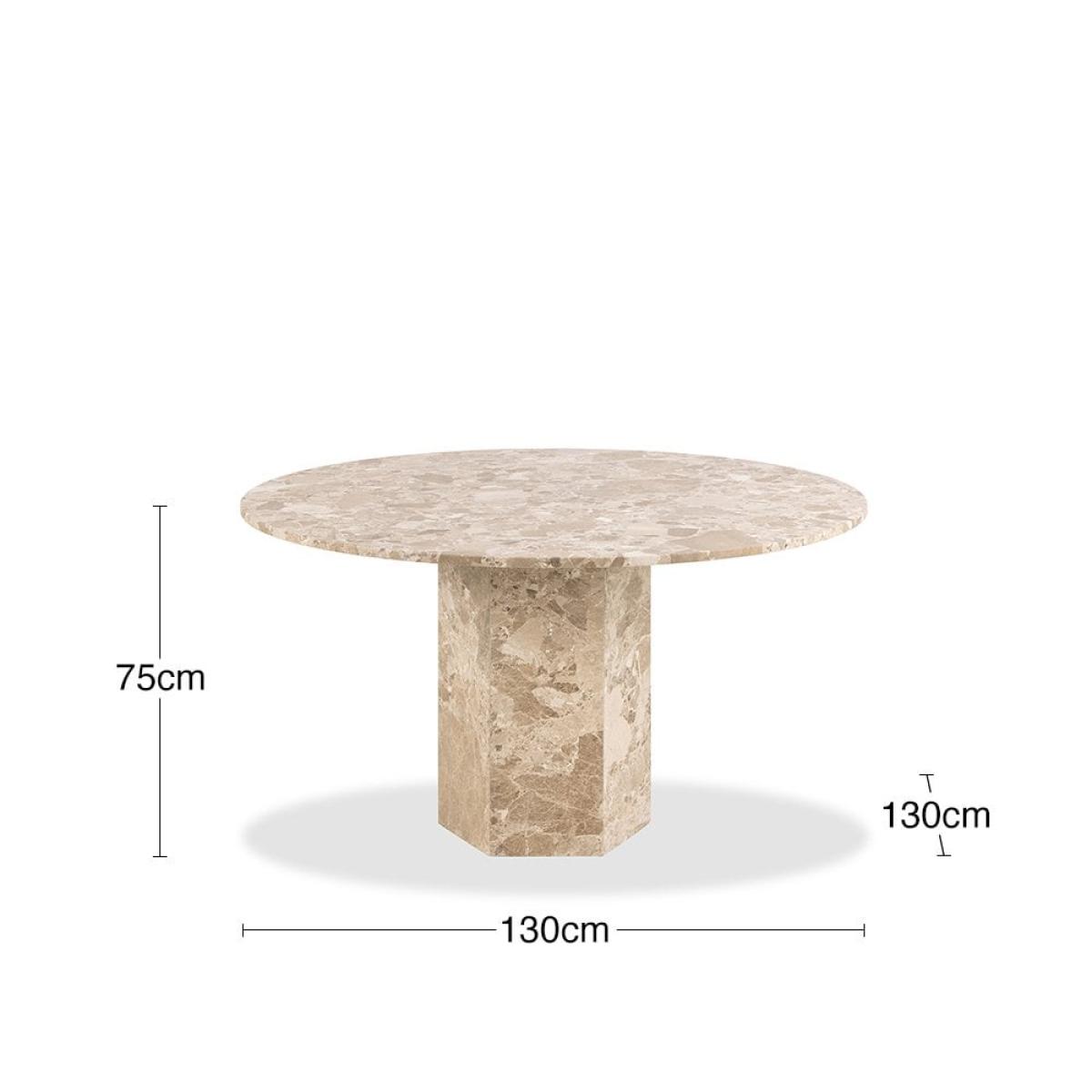 For an effortless fusion of Italian design and elegance, this dining table set is another level. The Naxos Dining Table is crafted from marble in soft light browns and creams with a sculptural design that could easily be a work of art. Combined with the Halston Dining Chair in dust blue sustainable velvet and curved metal frame has a walnut wood effect, this set is crafted for comfort. Includes 4 Halston Dining Chairs.