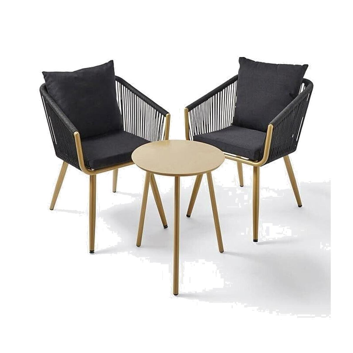 Add a touch of style to your outdoor space with this elegant 2 Seater Rope Bistro Set by Joanna Hope Naya. This set includes two chairs, a round table with a beautiful metallic gold tabletop, and comfortable black cushions. The chairs have a black rattan back and seat with armrests and a sturdy steel frame, while the table has a durable metal frame with a rattan tabletop. Assembly is required for this three-piece set, which is perfect for small spaces and intimate gatherings. With its sleek design and features such as a backrest and cushions, this bistro set provides both comfort and style. Ideal for use in your garden or patio, this set is sure to impress your guests.