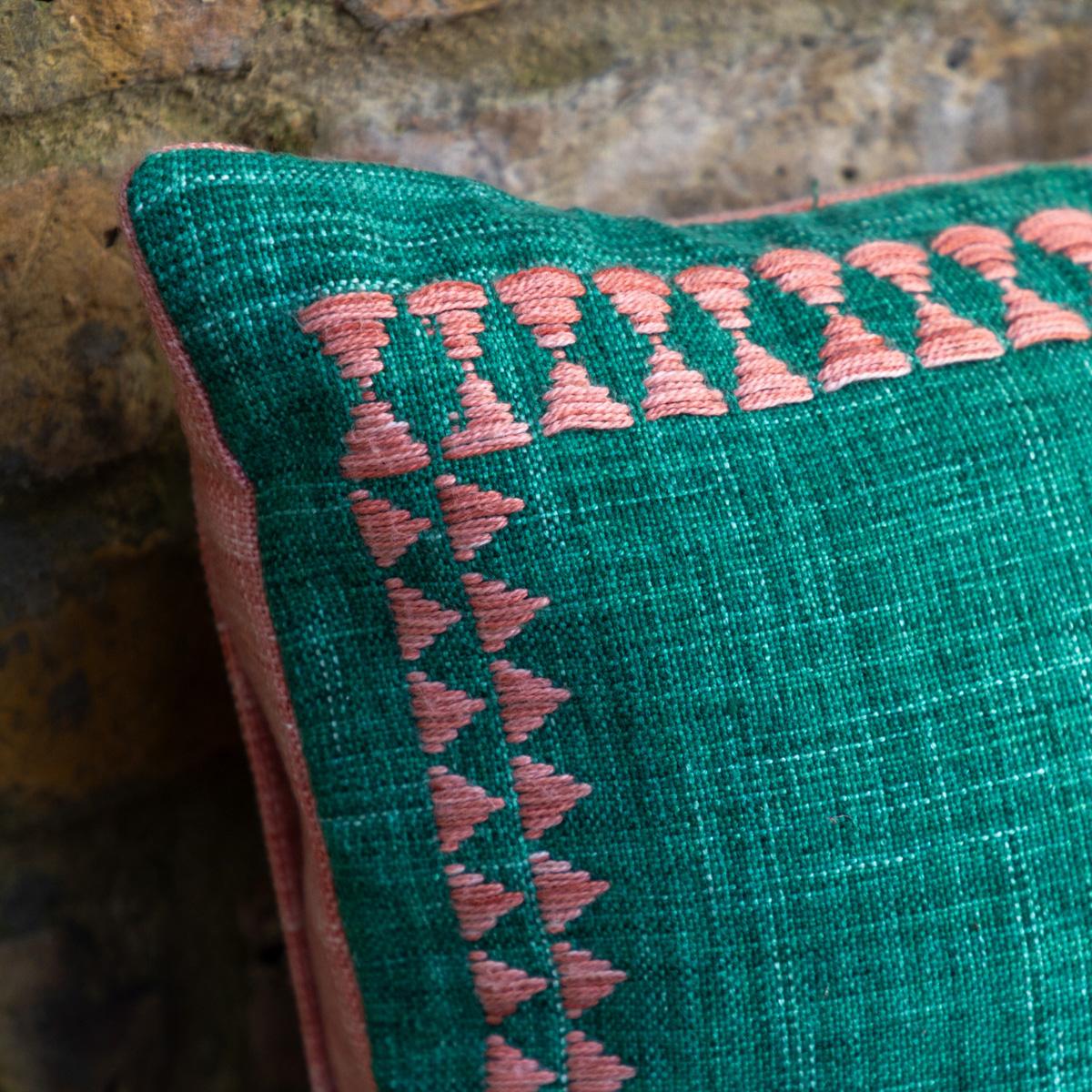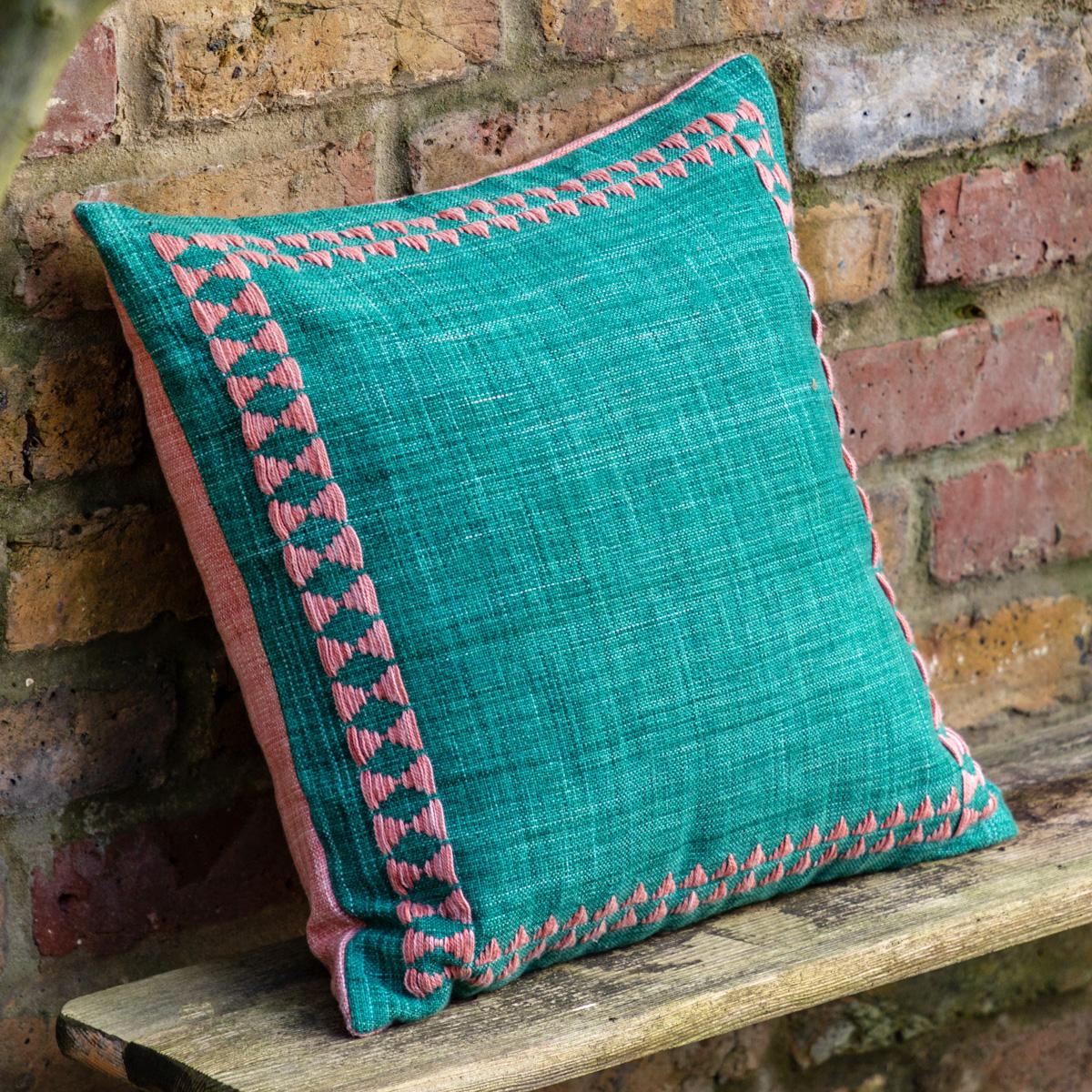 This cushion is a fantastic choice for adding a pop of colour and subtle texture to a variety of interiors. I love how the embroidered border lends a crafted, artisanal feel, making it perfect for both contemporary and boho spaces. It works particularly well mixed with neutral-toned sofas or beds, providing a vibrant accent that still feels grounded. For styling tips, try pairing it with soft linen or woven throws, and consider stacking it with other cushions in complementary shades or textures to create a layered, inviting look. Its versatile green hue makes it easy to incorporate into both indoor lounges and outdoor seating areas, making it a practical yet stylish addition.