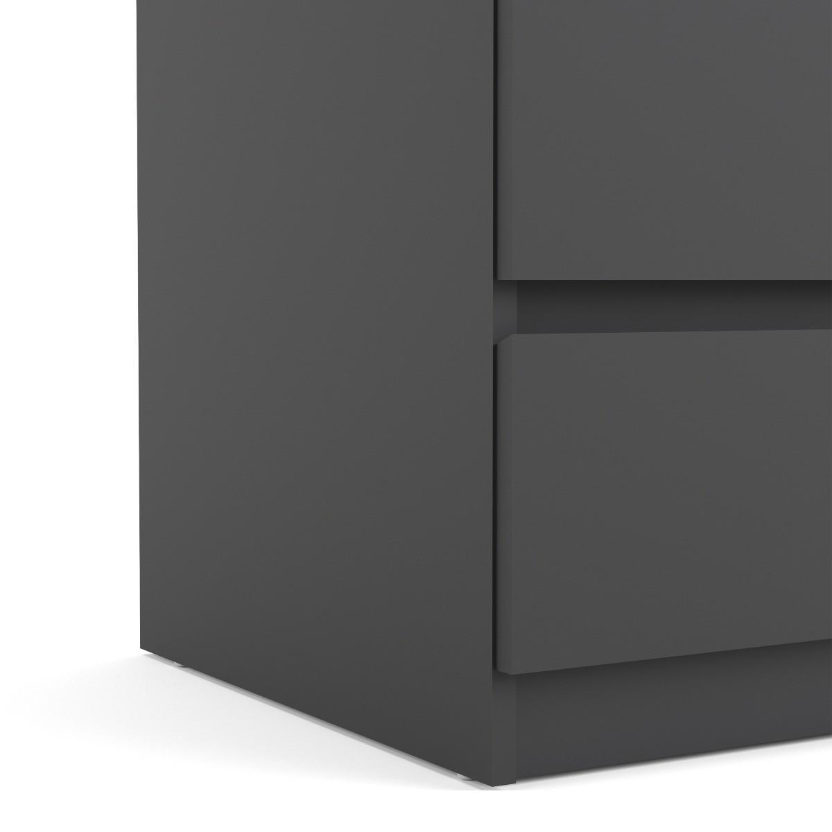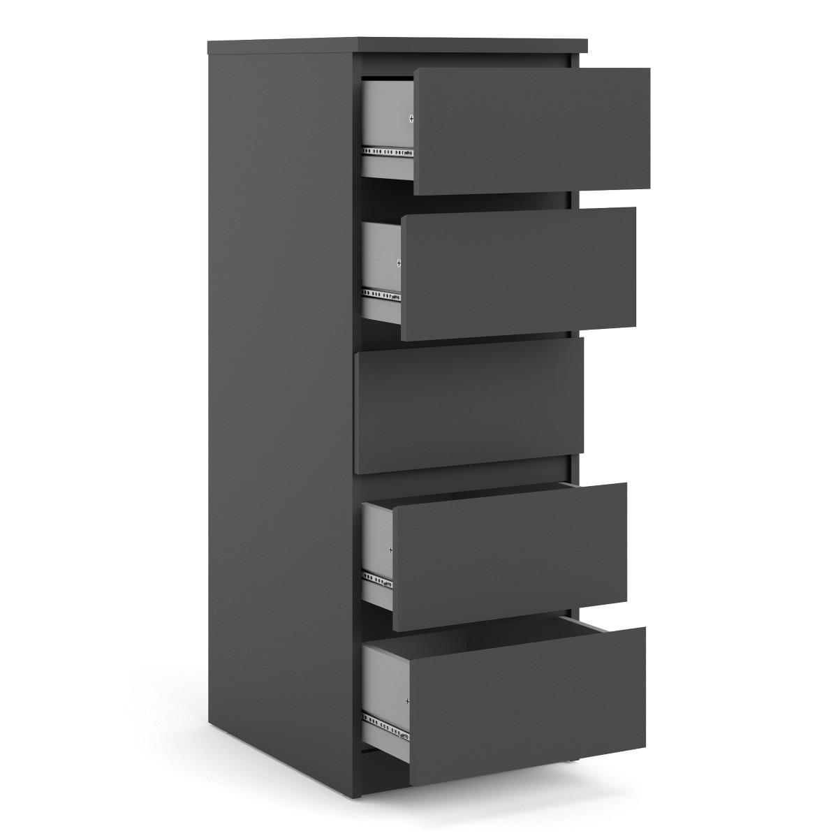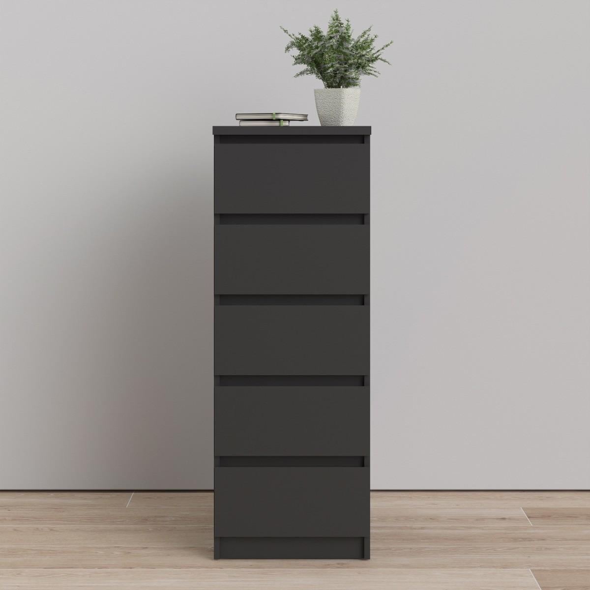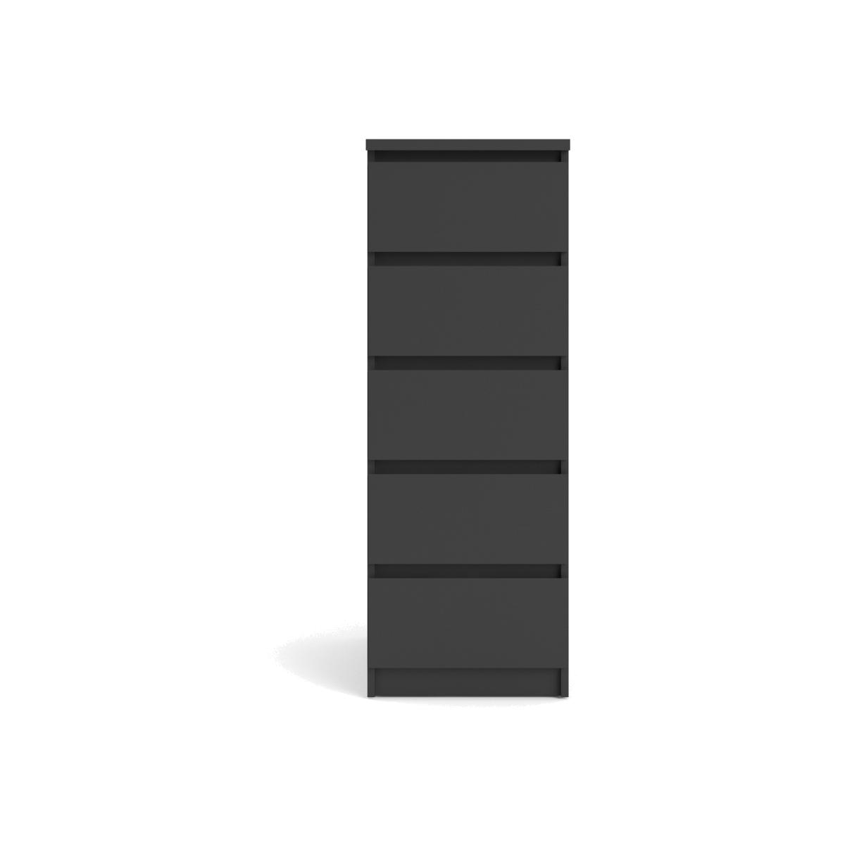 The Naya collection offers a tribute to timeless furniture design with a modern edge. This range is about so much more than just home storage. A Naya piece completely transforms the tone of a room. See how the irresistible hues of this space saving chest add drama and to your bedroom. Laminated board with increased resistance to scratches and damage5 drawers on smooth gliding runners. Ergonomic handle-free system for comfortable use and soft close. Easy self-assembly. Choose from matt black, bright white high gloss, white and concrete or oak